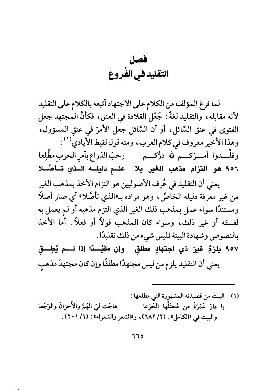 ٩٥٧ - يلزمُ غيرَ ذي اجتهادٍ مطلقِ ... وإن مقيَّدًا إذا لم يُطِقِ