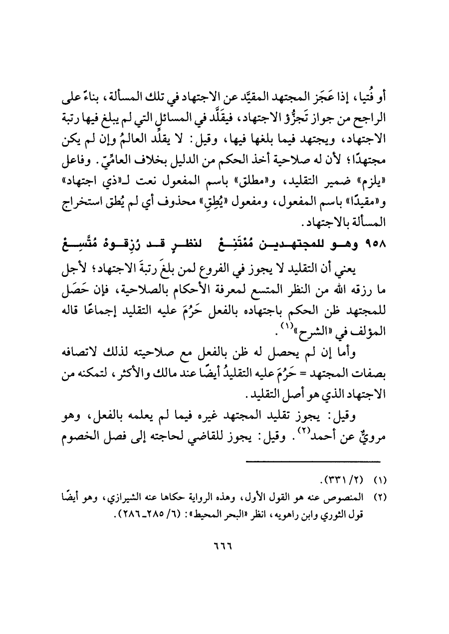 أو فُتيا، إذا عَجَز المجتهد المقيَّد عن الاجتهاد في تلك المسألة، بناءً على الراجح من جواز تَجزُّؤ الاجتهاد، فيقَلَّد في المسائل التي لم يبلغ فيها رتبة الاجتهاد، ويجتهد فيما بلغها فيها، وقيل: لا يقلِّد العالمُ وإن لم يكن مجتهدًا؛ لأن له صلاحية أخذ الحكم من الدليل بخلاف العامِّيّ. وفاعل "يلزم" ضمير التقليد، و"مطلق" باسم المفعول نعت لـ "ذي اجتهاد" و"مقيدًا" باسم المفعول، ومفعول "يُطِقِ" محذوف أي لم يُطق استخراج المسألة بالاجتهاد.