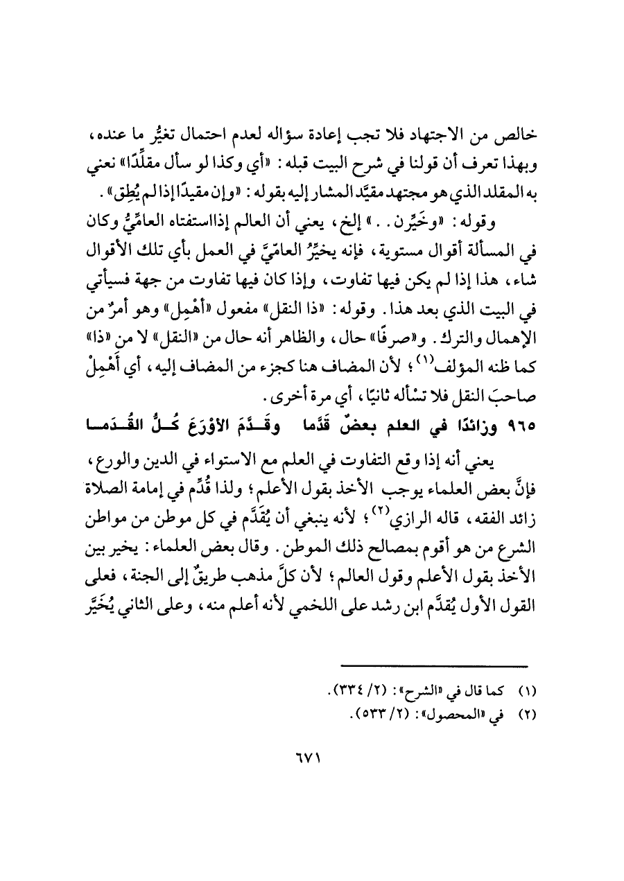يعني أنه إذا وقع التفاوت في العلم مع الاستواء في الدين والورع، فإنَّ بعض العلماء يوجب الأخذ بقول الأعلمِ؛ ولذا قُدِّم في إمامة الصلاة زائد الفقه، قاله الرازي (¬٢)، لأنه ينبغي أن يُقدَّم في كل موطن من مواطن الشرع من هو أقوم بمصالح ذلك الموطن. وقال بعض العلماء: يخير بين الأخذ بقول الأعلم وقول العالم؛ لأن كلَّ مذهب طريقٌ إلى الجنة، فعلى القول الأول يُقدَّم ابن رشد على اللخمي لأنه أعلم منه، وعلى الثاني يُخَيَّر