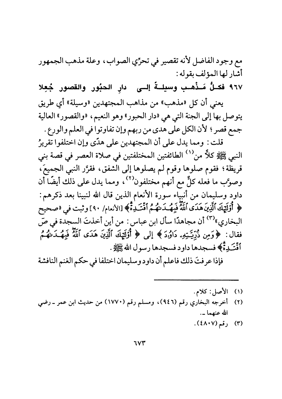 قلت: ومما يدل على أن المجتهدين على هدًى وإن إختلفوا تقريرُ النبي -صلى اللَّه عليه وسلم- كلًّا من (¬١) الطائفتين المختلفتين في صلاة العصر في قصة بني قريظة، فقوم صلوها وقوم لم يصلوها إلى الشفق، فقرَّر النبي الجميعَ، وصوَّب ما فعله كلٌّ مع أنهم مختلفون (¬٢)، ومما يدل على ذلك أيضًا أن داود وسليمان من أنبياء سورة الأنعام الذين قال اللَّه لنبينا بعد ذكرهم: {أُولَئِكَ الَّذِينَ هَدَى اللَّهُ فَبِهُدَاهُمُ اقْتَدِه} [الأنعام/ ٩٠] وثبت في "صحيح البخاري" (¬٣) أن مجاهدًا سأل ابن عباس: من أين أخذتَ السجدة في ص فقال: {وَمِنْ ذُرِّيَّتِهِ دَاوُودَ} إلى {أُولَئِكَ الَّذِينَ هَدَى اللَّهُ فَبِهُدَاهُمُ اقْتَدِه} فسجدها داود فسجدها رسول اللَّه -صلى اللَّه عليه وسلم-.