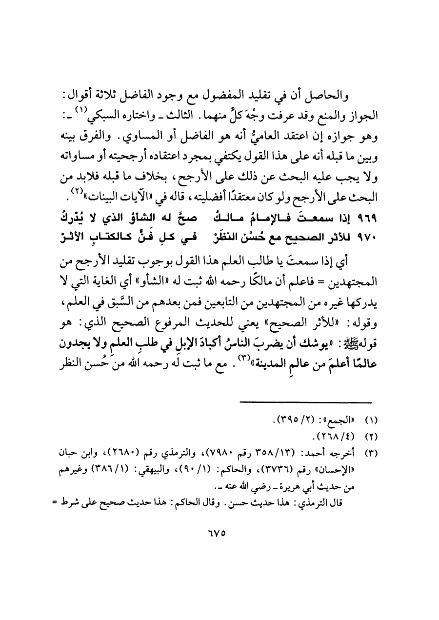 أي إذا سمعتَ يا طالب العلم هذا القول بوجوب تقليد الأرجح من المجتهدين = فاعلم أن مالكًا رحمه اللَّه ثبت له "الشأو" أي الغاية التي لا يدركها غيره من المجتهدين من التابعين فمن بعدهم من السَّبق في العلم، وقوله: "للأثر الصحيح" يعني للحديث المرفوع الصحيح الذي: هو قوله -صلى اللَّه عليه وسلم-: "يوشك أن يضربَ الناسُ أكبادَ الإبلِ في طلبِ العلمِ ولا يجدون عالمًا أعلمَ من عالمِ المدينة" (¬٣). مع ما ثبت له رحمه اللَّه من حُسن النظر