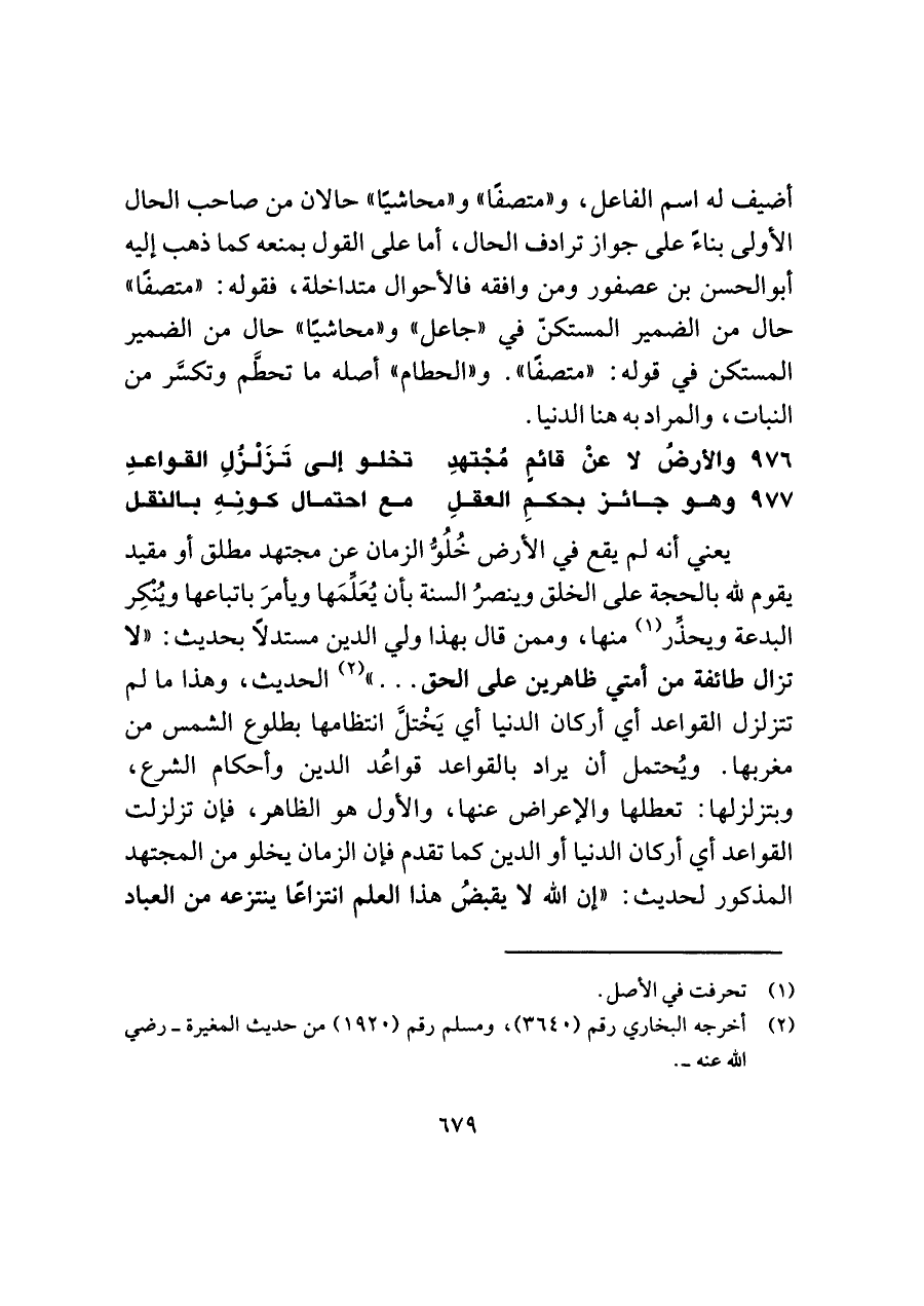 يعني أنه لم يقع في الأرض خُلُوُّ الزمان عن مجتهد مطلق أو مقيد يقوم للَّه بالحجة على الخلق وينصرُ السنة بأن يُعَلِّمَها ويأمرَ باتباعها ويُنكر البدعة ويحذِّر (¬١) منها، وممن قال بهذا ولي الدين مستدلًا بحديث: "لا تزال طائفة من أمتي ظاهرين على الحق. . . " (¬٢) الحديث، وهذا ما لم تتزلزل القواعد أي أركان الدنيا أي يَخْتلَّ انتظامها بطلوع الشمس من مغربها. ويُحتمل أن يراد بالقواعد قواعُد الدين وأحكام الشرع، وبتزلزلها: تعطلها والإعراض عنها، والأول هو الظاهر، فإن تزلزلت القواعد أي أركان الدنيا أو الدين كما تقدم فإن الزمان يخلو من المجتهد المذكور لحديث: "إن اللَّه لا يقبضُ هذا العلم انتزاعًا ينتزعه من العباد