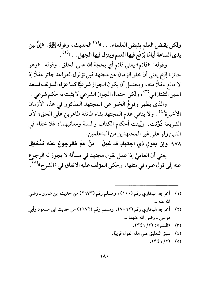 والذي يظهر وقوعُ الخلو عن المجتهد المذكور في هذه الأزمان الأخيرة (¬٤). ولا ينافي عدم المجتهد بقاء طائفة ظاهرين على الحق؛ لأن الشريعة دُوِّنت، وبُينت أحكام الكتاب والسنة ومعانيهما، فلا خفاء في الدين ولو على غير المجتهدين من المتعلمين.