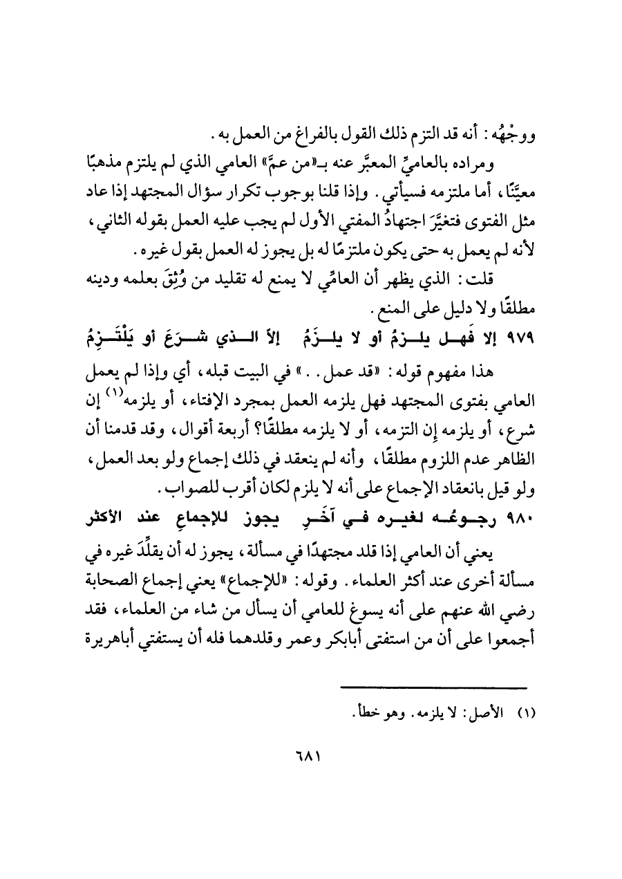 ومراده بالعاميِّ المعبَّر عنه بـ "من عمَّ" العامي الذي لم يلتزم مذهبًا معيَّنًا، أما ملتزمه فسيأتي. وإذا قلنا بوجوب تكرار سؤال المجتهد إذا عاد مثل الفتوى فتغيَّرَ اجتهادُ المفتي الأول لم يجب عليه العمل بقوله الثاني، لأنه لم يعمل به حتى يكون ملتزمًا له بل يجوز له العمل بقول غيره.