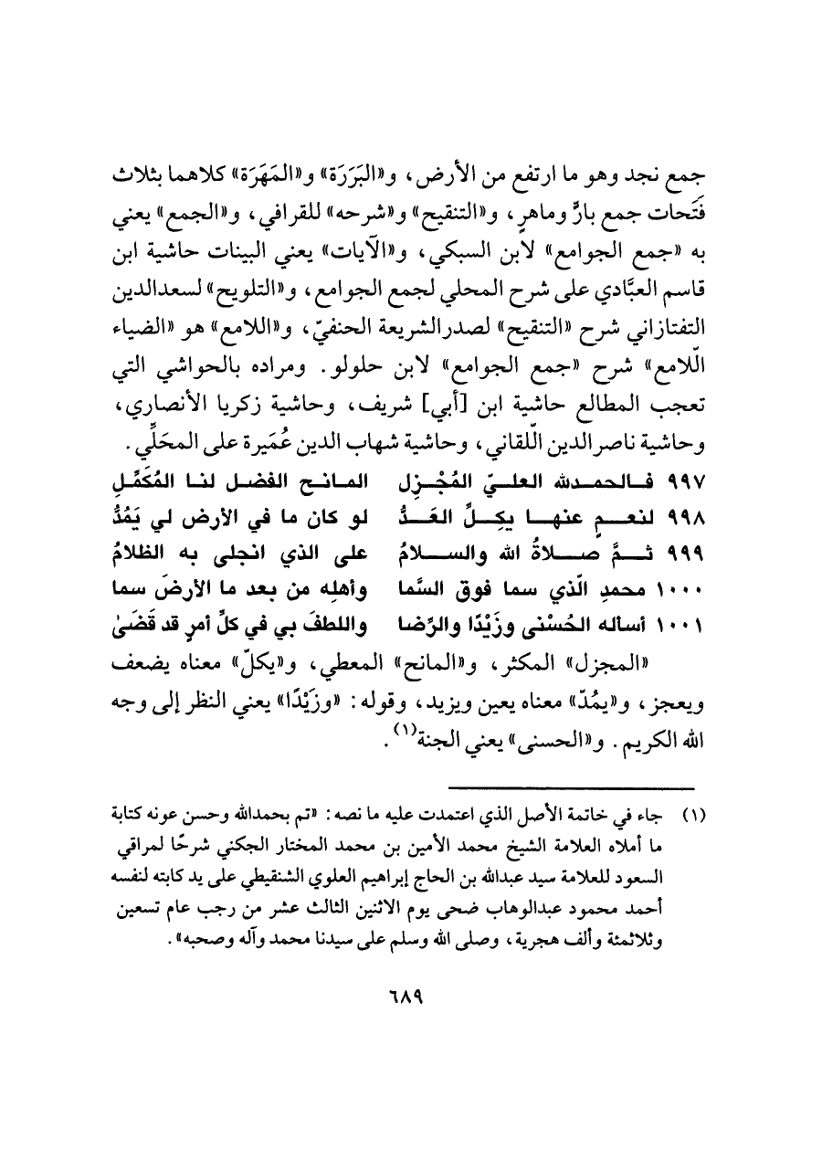 (¬١) جاء في خاتمة الأصل الذي اعتمدت عليه ما نصه: "تم بحمد اللَّه وحسن عونه كتابة ما أملاه العلامة الشيخ محمد الأمين بن محمد المختار الجكني شرحًا لمراقي السعود للعلامة سيد عبد اللَّه بن الحاج إبراهيم العلوي الشنقيطي على يد كابته لنفسه أحمد محمود عبد الوهاب ضحى يوم الاثنين الثالث عشر من رجب عام تسعين وثلاثمئة وألف هجرية، وصلى اللَّه وسلم على سيدنا محمد وآله وصحبه".