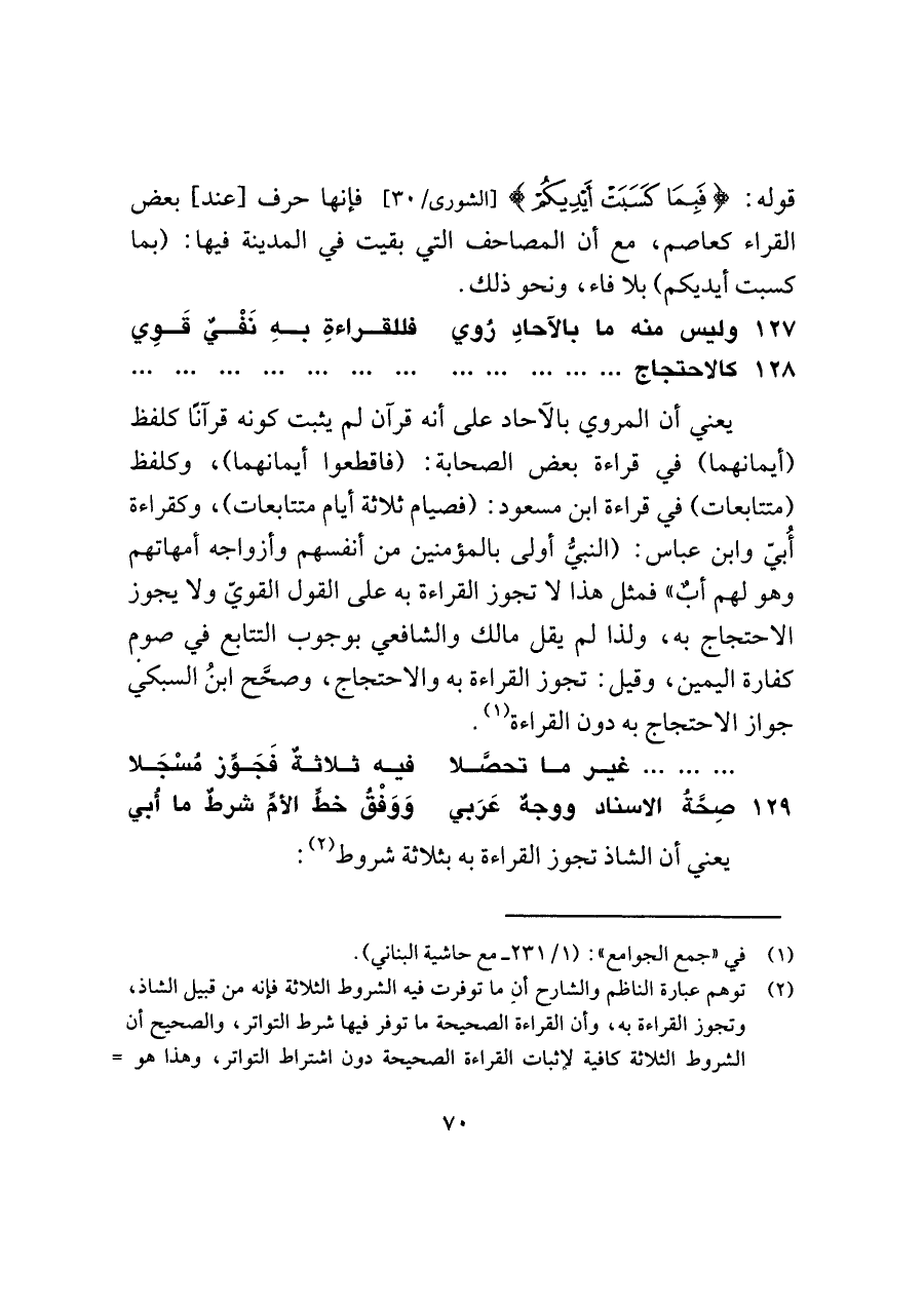 (¬٢) توهم عبارة الناظم والشارح أن ما توفرت فيه الشروط الثلاثة فإنه من قبيل الشاذ، وتجوز القراءة به، وأن القراءة الصحيحة ما توفر فيها شرط التواتر، والصحيح أن الشروط الثلاثة كافية لإثبات القراءة الصحيحة دون اشتراط التواتر، وهذا هو =