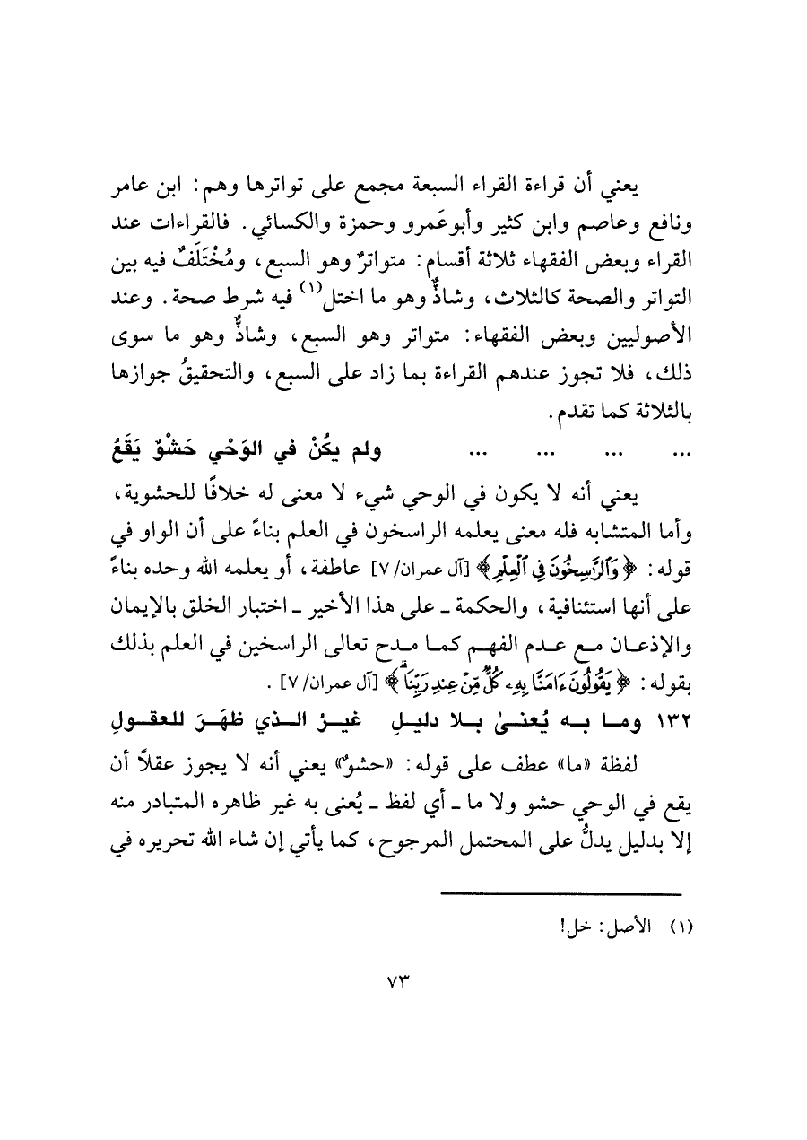 يعني أنه لا يكون في الوحي شيء لا معنى له خلافًا للحشوية، وأما المتشابه فله معنى يعلمه الراسخون في العلم بناءً على أن الواو في قوله: {وَالرَّاسِخُونَ فِي الْعِلْمِ} [آل عمران/ ٧] عاطفة، أو يعلمه اللَّه وحده بناءً على أنها استئنافية، والحكمة -على هذا الأخير- اختبار الخلق بالإيمان والإذعان مع عدم الفهم كما مدح تعالى الراسخين في العلم بذلك بقوله: {يَقُولُونَ آمَنَّا بِهِ كُلٌّ مِنْ عِنْدِ رَبِّنَا} [آل عمران/ ٧].