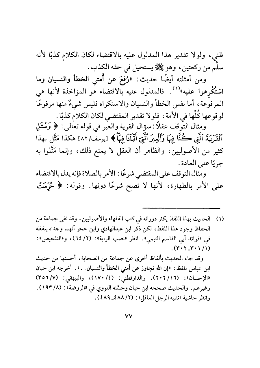 ومن أمثلته أيضًا حديث: "رُفِعَ عن أُمتي الخطأ والنسيان وما اسْتكرِهوا عليه" (¬١). فالمدلول عليه بالاقتضاء هو المؤاخذة لأنها هي المرفوعة، أما نفس الخطأ والنسيان والاستكراه فليس شيءٌ منها مرفوعًا لوقوعها كُلِّها في الأمة، فلولا تقدير المقتضي لكان الكلام كذبًا.