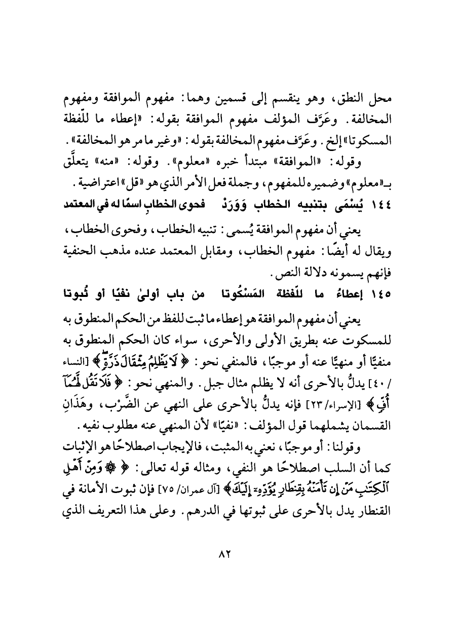 يعني أن مفهوم الموافقة هو إعطاء ما ثبت للفظ من الحكم المنطوق به للمسكوت عنه بطريق الأولى والأحرى، سواء كان الحكم المنطوق به منفيًّا أو منهيًّا عنه أو موجبًا، فالمنفي نحو: {لَا يَظْلِمُ مِثْقَالَ ذَرَّةٍ} [النساء/ ٤٠] يدلُّ بالأحرى أنه لا يظلم مثال جبل. والمنهي نحو: {فَلَا تَقُلْ لَهُمَا أُفٍّ} [الإسراء/ ٢٣] فإنه يدلُّ بالأحرى على النهي عن الضَّرْب، وهَذَانِ القسمان يشملهما قول المؤلف: "نفيًا" لأن المنهي عنه مطلوب نفيه.