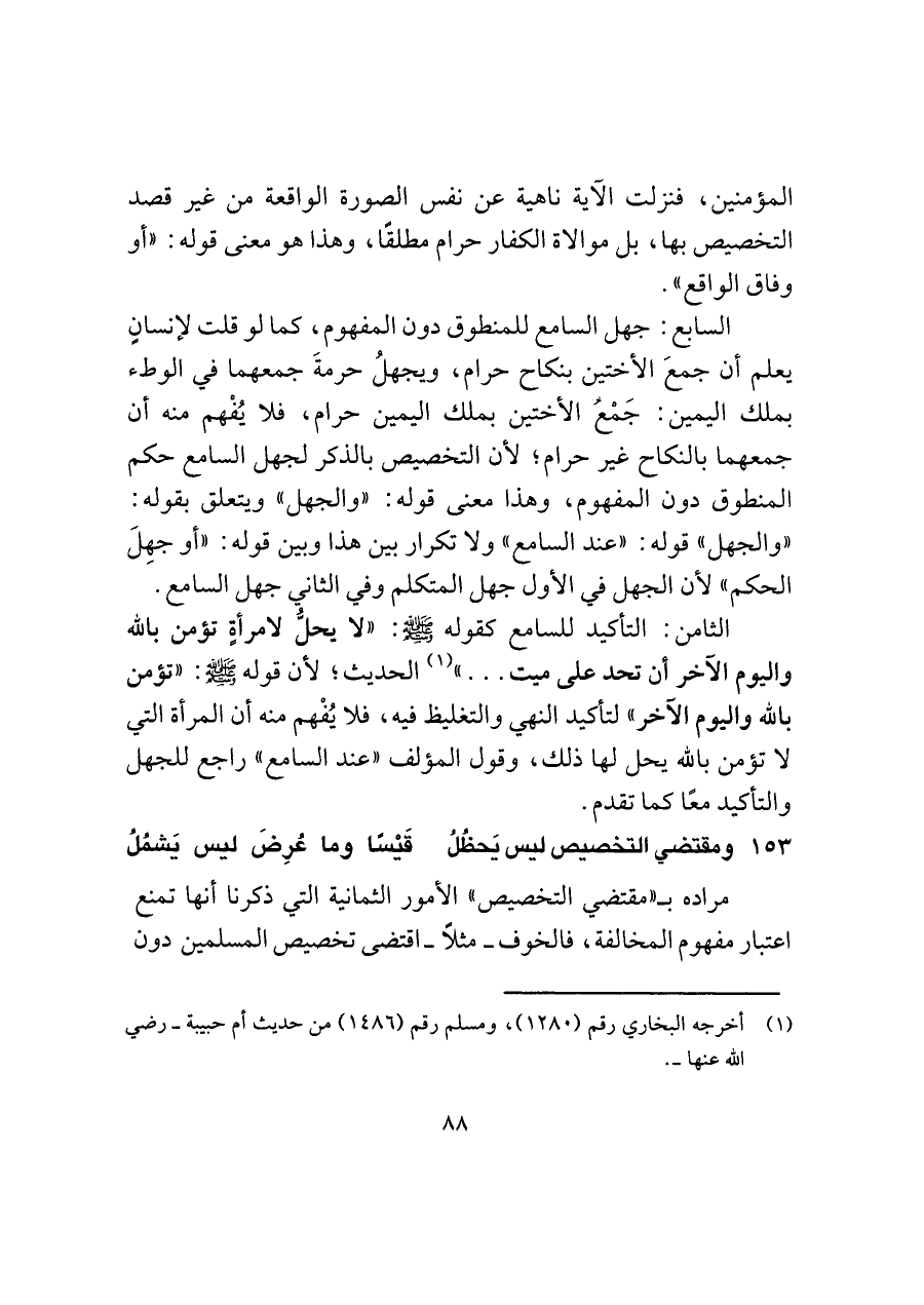 الثامن: التأكيد للسامع كقوله -صلى اللَّه عليه وسلم-: "لا يحلُّ لامرأةٍ تؤمن باللَّه واليوم الآخر أن تحد على ميت. . . " (¬١) الحديث؛ لأن قوله -صلى اللَّه عليه وسلم-: "تؤمن باللَّه واليوم الآخر" لتأكيد النهي والتغليظ فيه، فلا يُفْهم منه أن المرأة التي لا تؤمن باللَّه يحل لها ذلك، وقول المؤلف "عند السامع" راجع للجهل والتأكيد معًا كما تقدم.