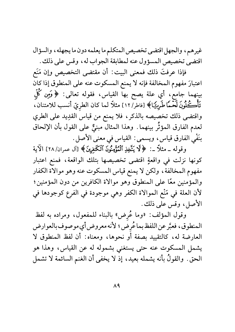 وقوله -مثلًا-: {لَا يَتَّخِذِ الْمُؤْمِنُونَ الْكَافِرِينَ} [آل عمران/ ٢٨] الآية كونها نزلت في واقعةٍ اقتضى تخصيصها بتلك الواقعة، فمنع اعتبار مفهوم المخالفة، ولكن لا يمنع قياس المسكوت عنه وهو موالاة الكفار والمؤمنين معًا على المنطوق وهو موالاة الكافرين من دون المؤمنين؛ لأن العلة في مَنْع الموالاة الكفر وهي موجودة في الفرع كوجودها في الأصل، وقس على ذلك.