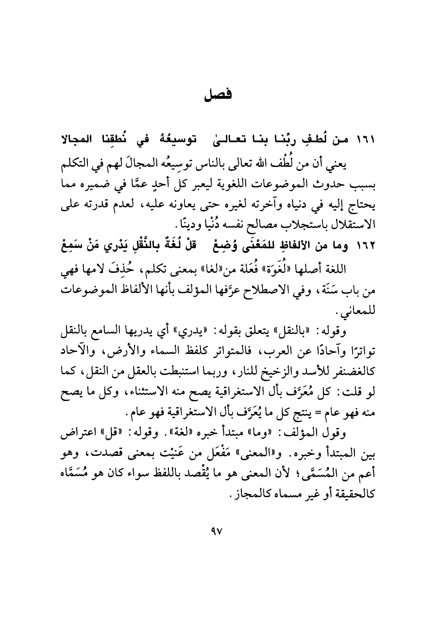 ١٦٢ - وما من الألفاظِ للمَعْنَى وُضِعْ ... قلْ لُغَةٌ بالنَّقْلِ يَدْري مَنْ سَمِعْ