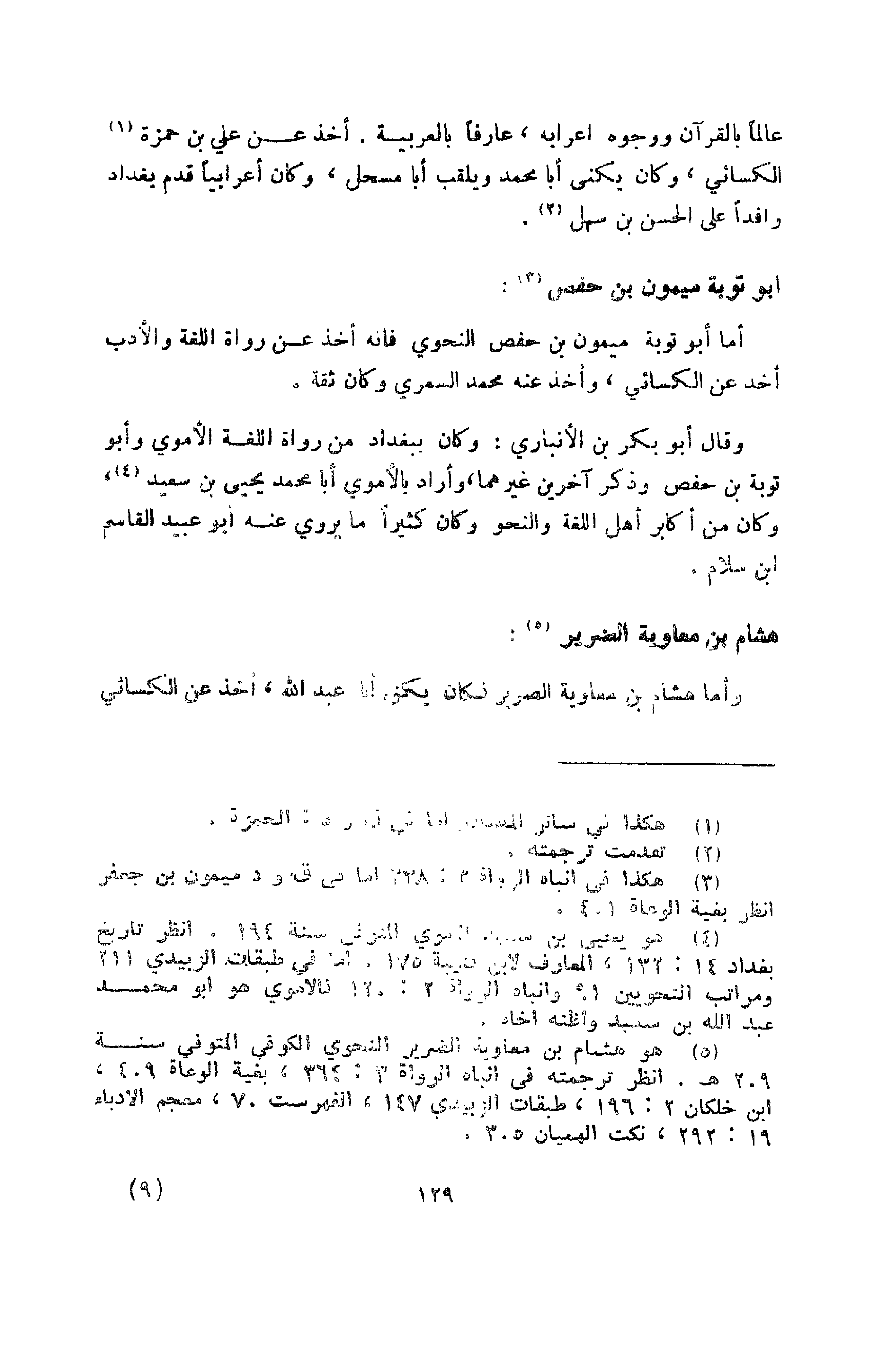 وأما هشام بن معاوية الضرير، فكان يكنى أبا عبد الله، أخذ عن الكسائي،