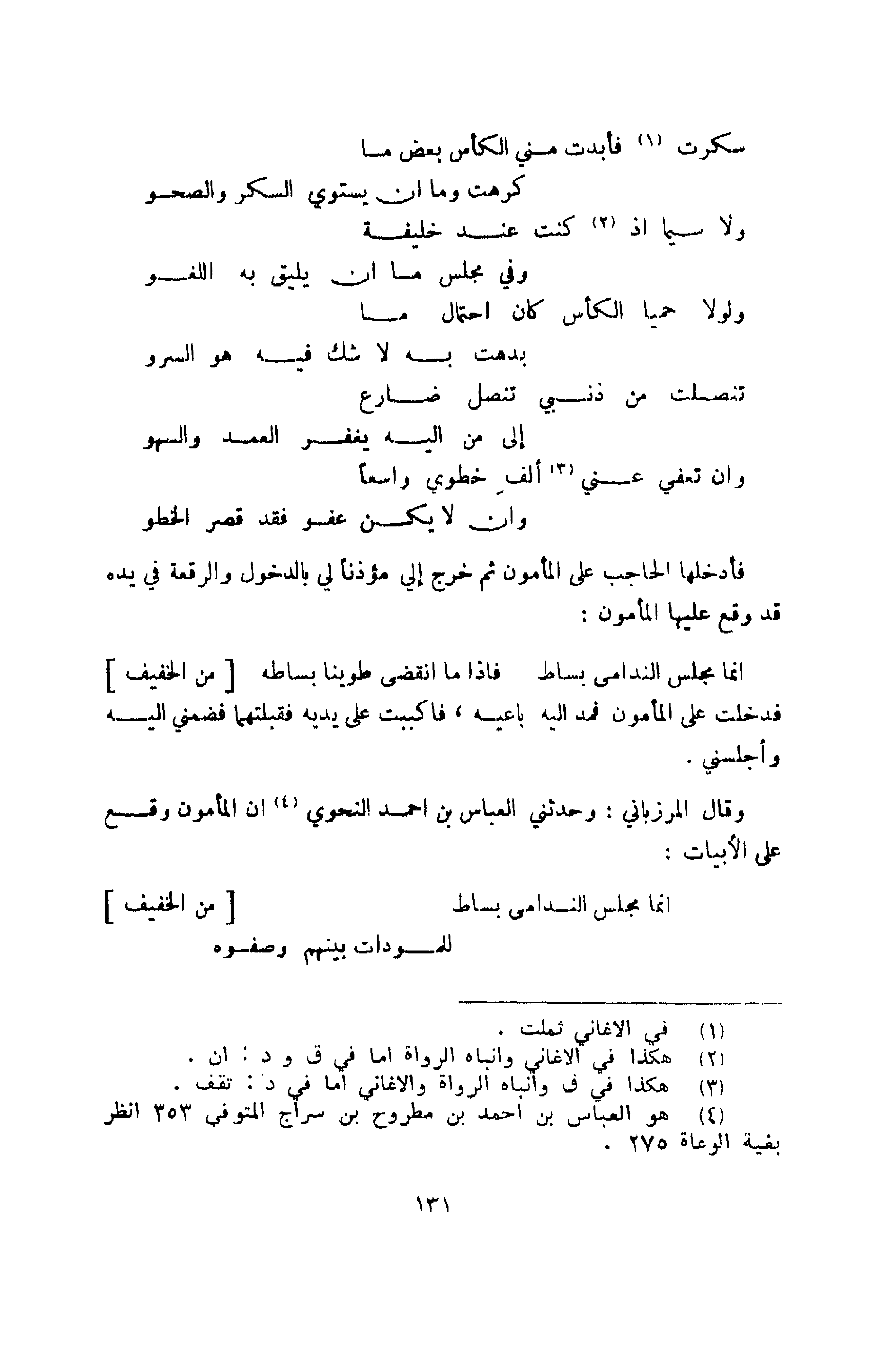 وقال المرزباني: وحدثني العباس بن أحمد النحوي أن المأمون وقع على الأبيات: