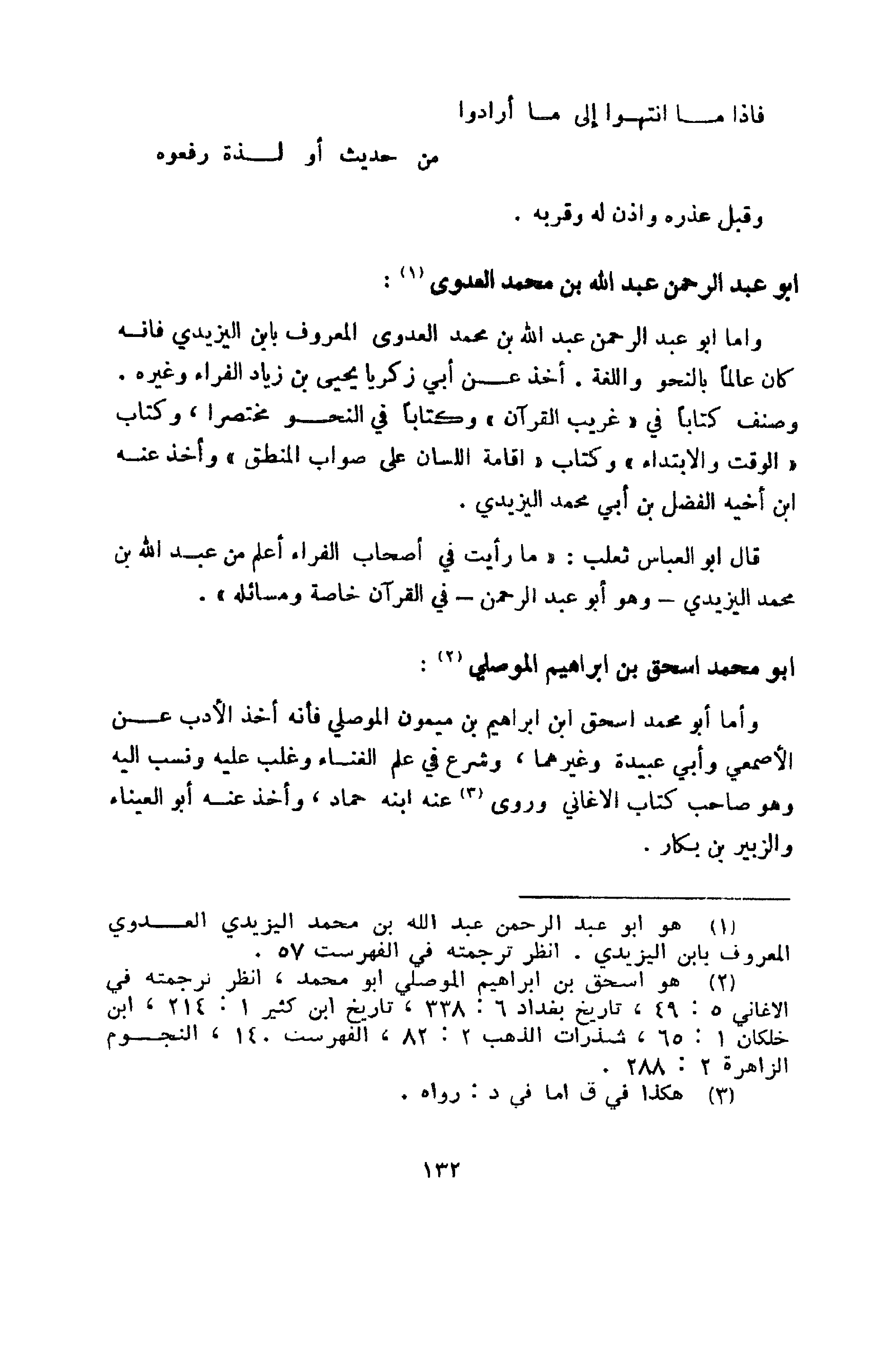 وأما أبو عبد الرحمن عبد الله بن [أبي] محمد العدوي، والمعروف بابن اليزيدي؛ فإنه كان عالماً بالنحو واللغة؛ وأخذ عن أبي زكرياء يحيى بن زياد الفراء وغيره، وصنف كتاباً في غريب القرآن وكتاباً في النحو مختصراً، وكتاب الوقف والابتداء، وكتاب إقامة اللسان على صواب المنطق؛ وأخذ عنه ابن أخيه الفضل بن اليزيدي.