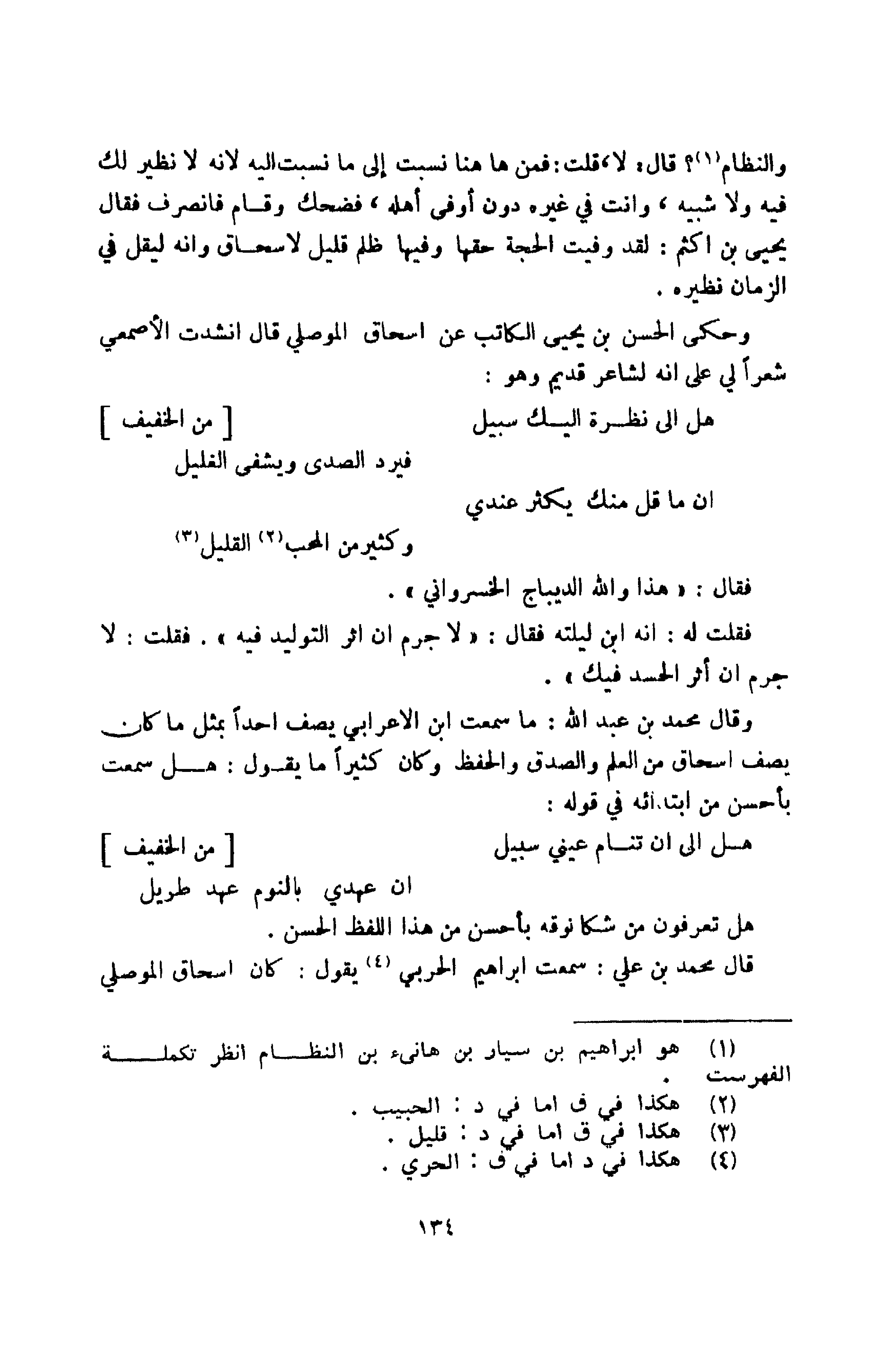 هل تعرفون من شكا نومه بأحسن من هذا اللفظ الحسن! قال محمد بن علي: سمعت إبراهيم الحربي يقول: كان إسحاق الموصلي