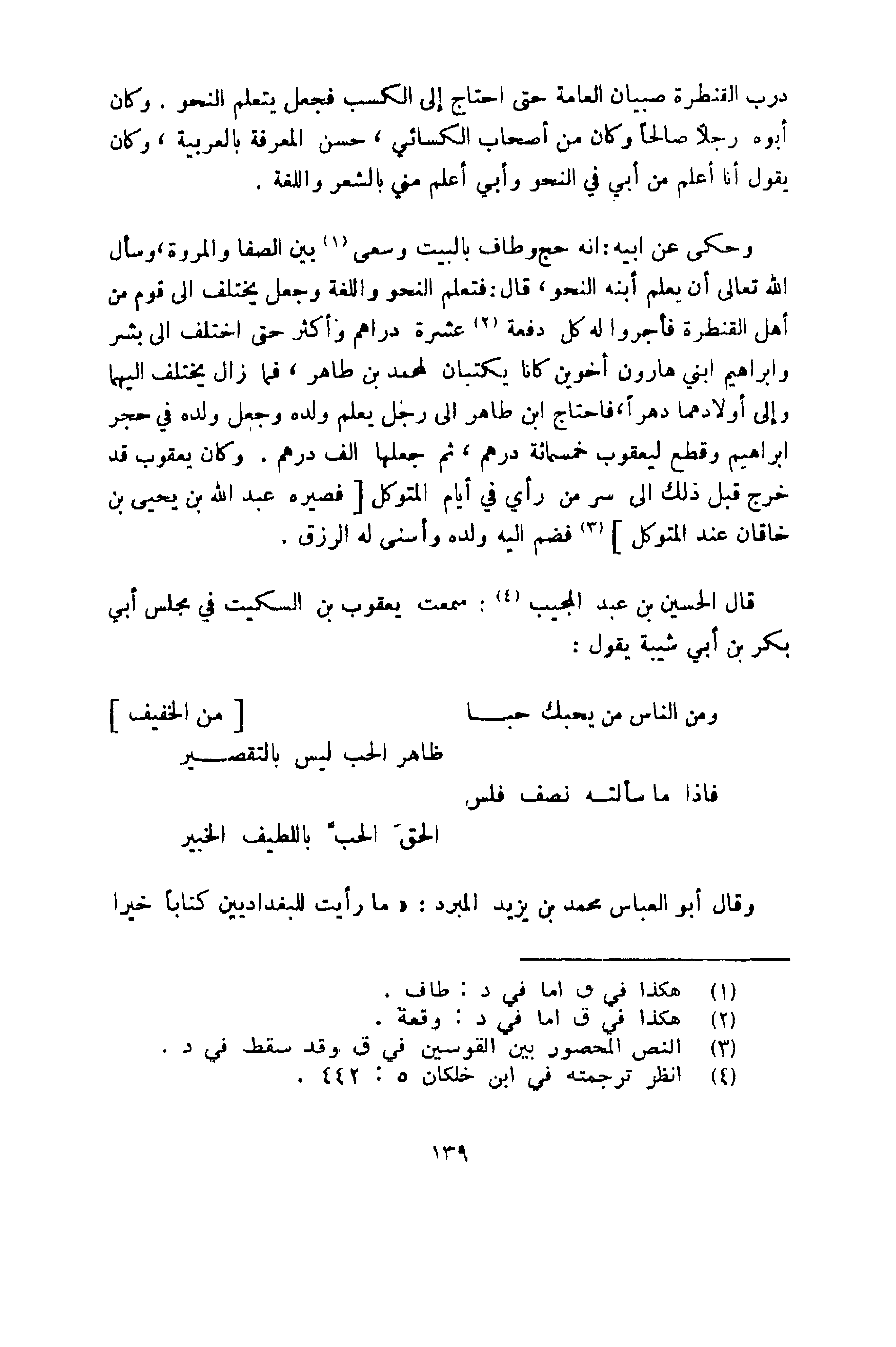 قال الحسين بن عبد المجيب: سمعت يعقوب بن السكيت في مجلس أبي بكر بن أبي شيبة يقول: