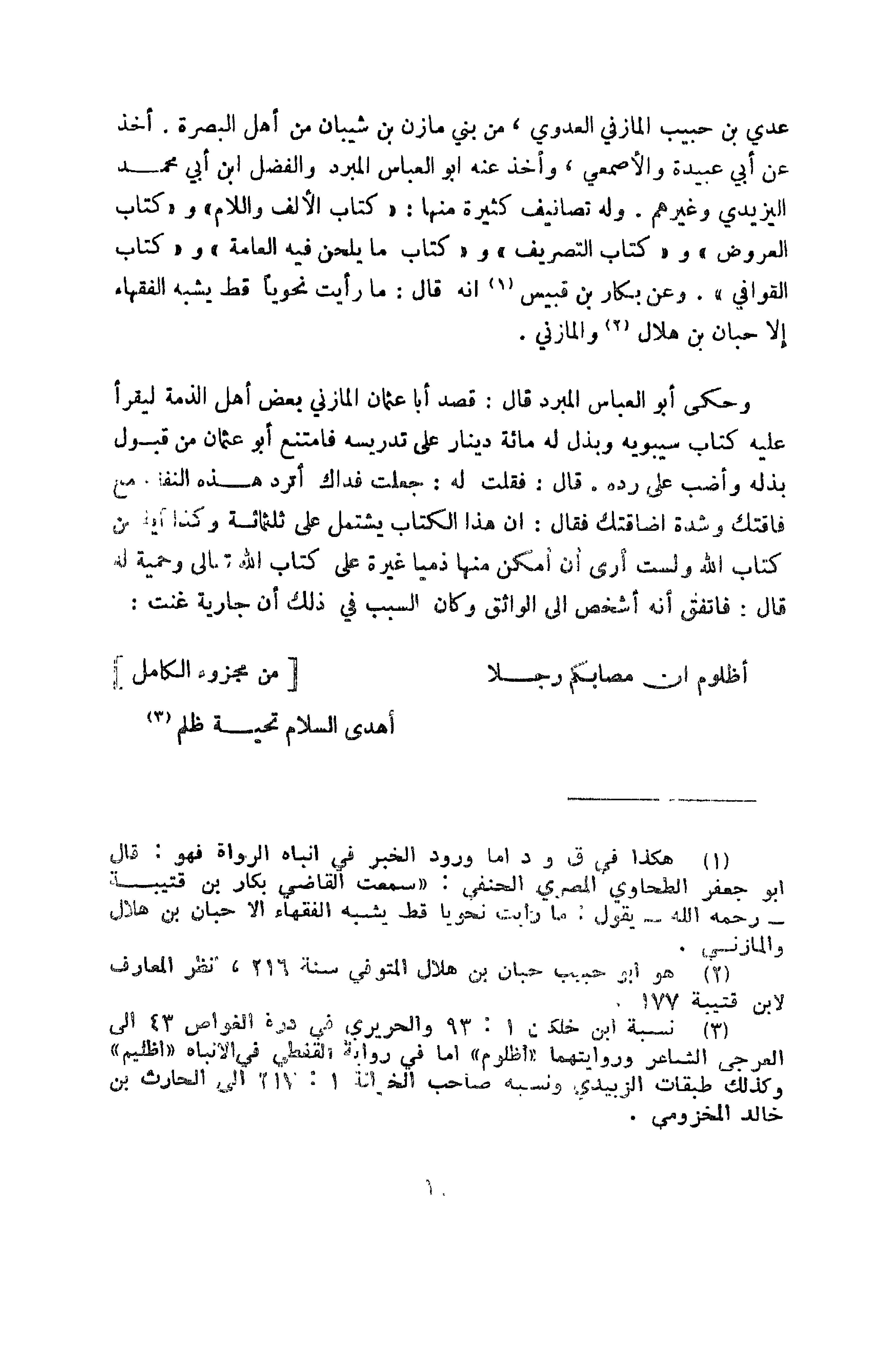 وعن بكار بن قتيبة أنه قال: ما رأيت نحوياً قط يشبه الفقهاء إلا حيان بن هلال والمازني.