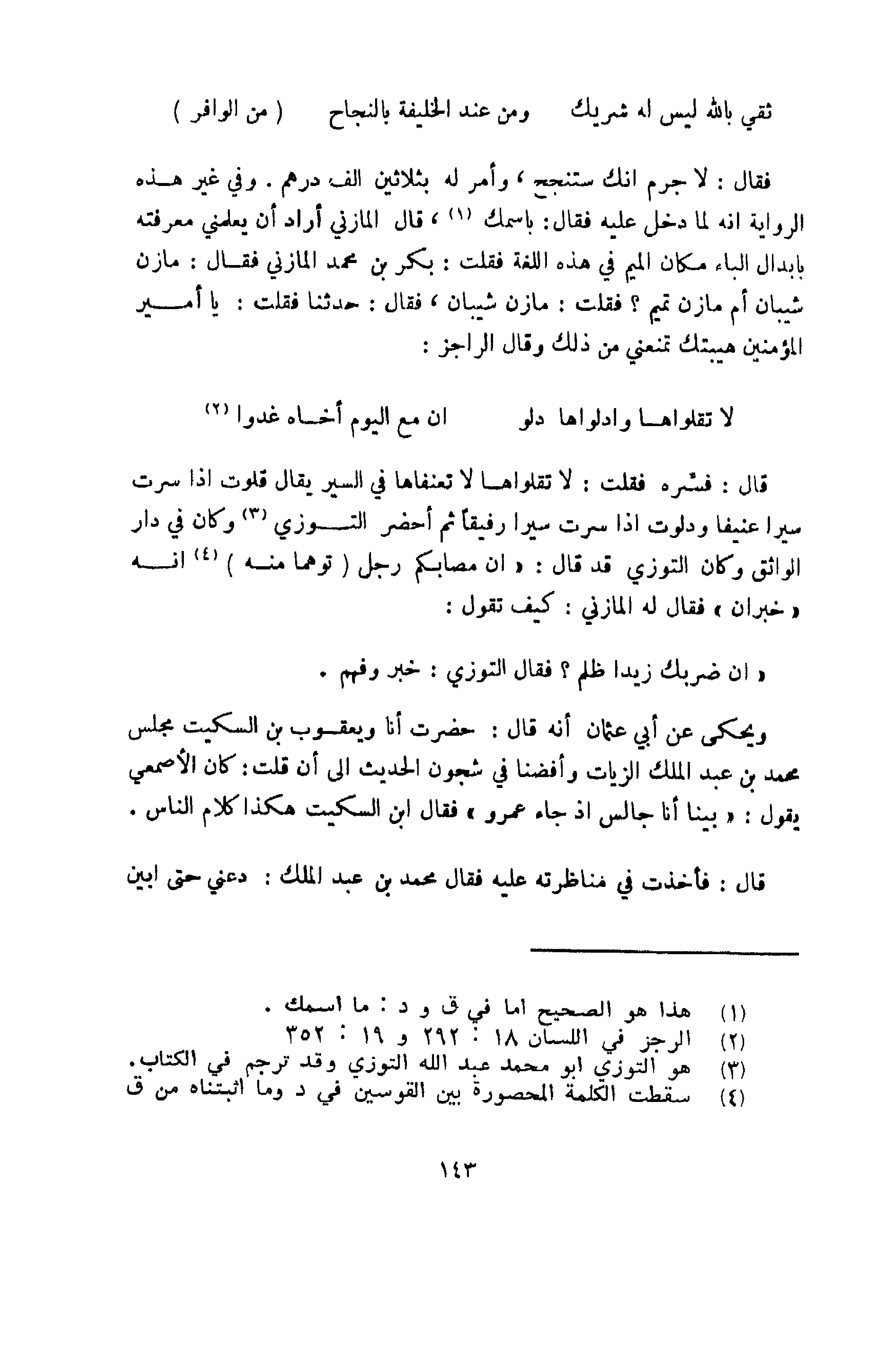 وفي غير هذه الرواية أنه لما دخل عليه قال: باسمك؟ - قال المازني: أراد أن يعلمني معرفته بإبدال الباء مكان الميم في هذه اللغة - فقلت: بكر بن محمد المازني، فقال: مازن شيبان أم مازن تميم؟ فقلت: مازن شيبان؛ فقال: حدثنا، فقلت: يا أمير المؤمنين، هيبتك تمنعني من ذلك [وقد] وقال الراجز: