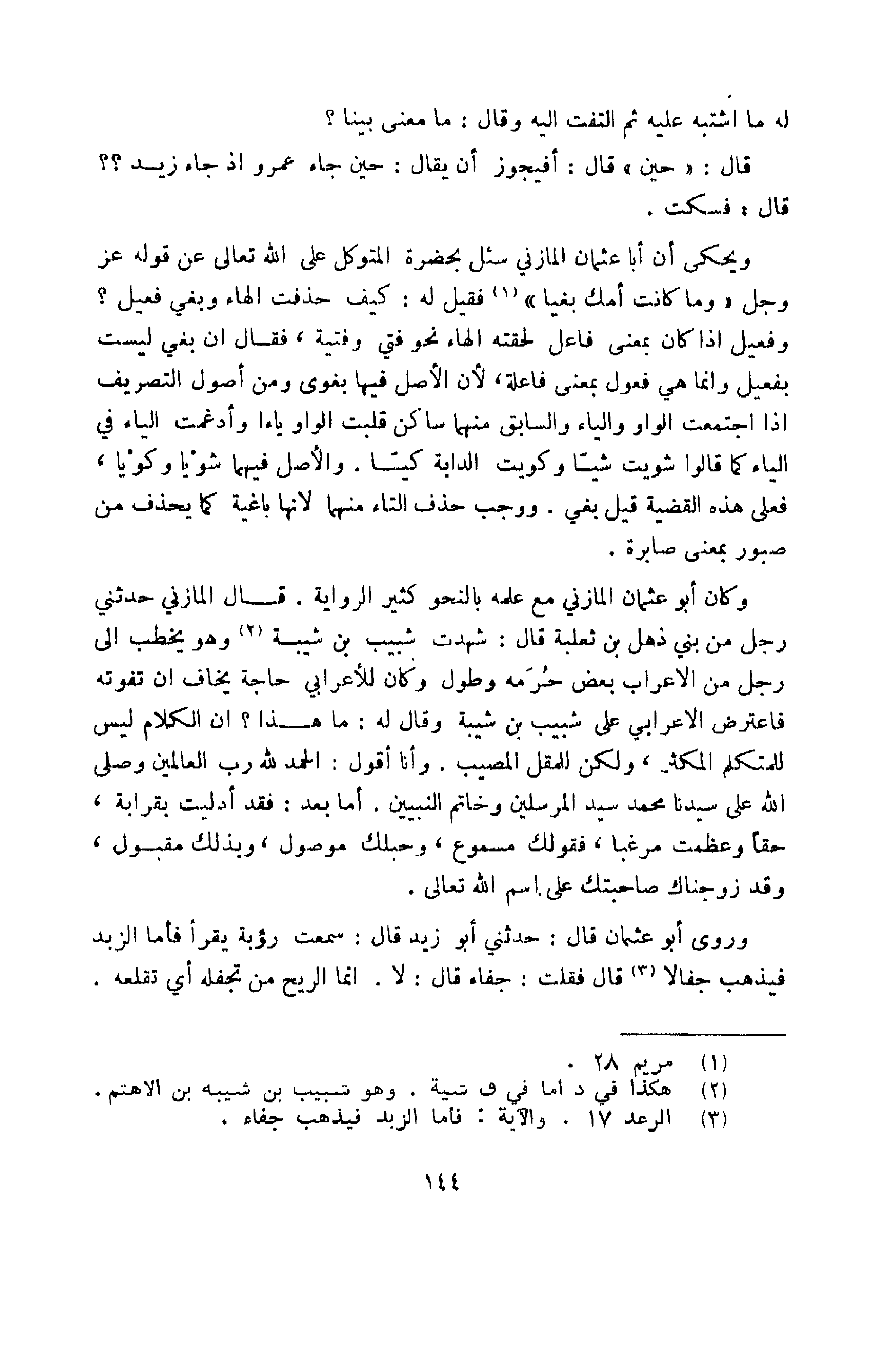 وكان أبو عثمان المازني مع علمه بالنحو كثير الرواية، قال المازني: حدثني رجل من بني ذهل بن ثعلبة، قال: شهدت شبيب بن شيبة، وهو يخطب إلى رجل من الأعراب بعض حرمه، وطول. وكان للأعرابي حاجة يخاف أن تفوته، فاعترض الأعرابي على شبيب، وقال له: ما هذا؟ إن الكلام ليس للمتكلم المكثر، ولكن للمقل المصيب، وأنا أقول: الحمد لله رب العالمين، وصلى الله على سيدنا محمد سيد المرسلين، وخاتم النبيين، أما بعد: فقد أدليت بقرابة، وذكرت حقاً، وعظمت مرغبا؛ فقولك مسموع، وحبلك موصول، وبذلك مقبول، وقد زوجناك صاحبتك على اسم الله تعالى.
