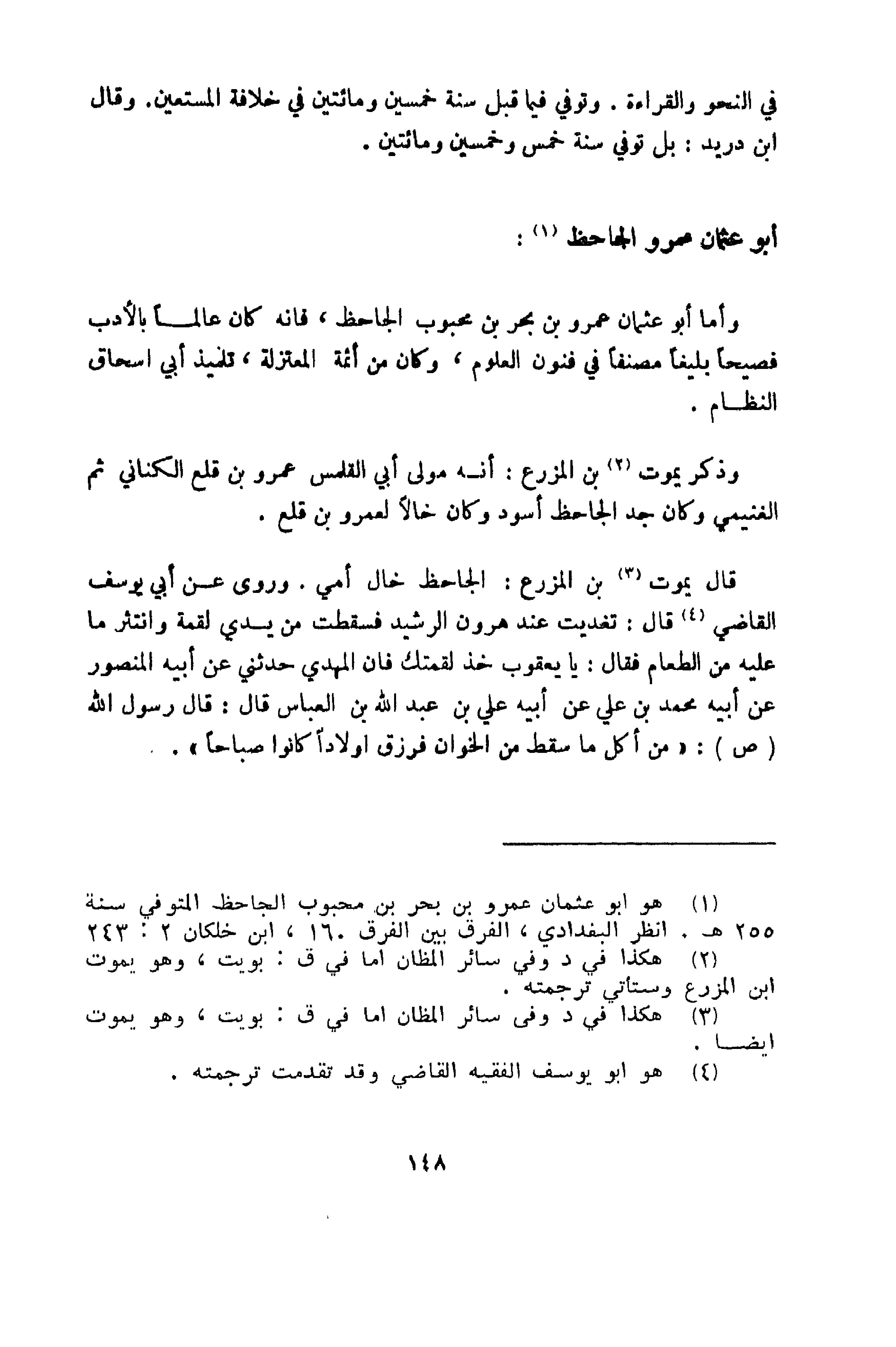 وأما أبو عثمان عمرو بن بحر بن محبوب الجاحظ؛ فإنه كان عالماً بالأدب فصيحاً بليغاً، مصنفاً في فنون العلوم، وكان من أئمة المعتزلة، تلميذ أبي إسحاق النظام.