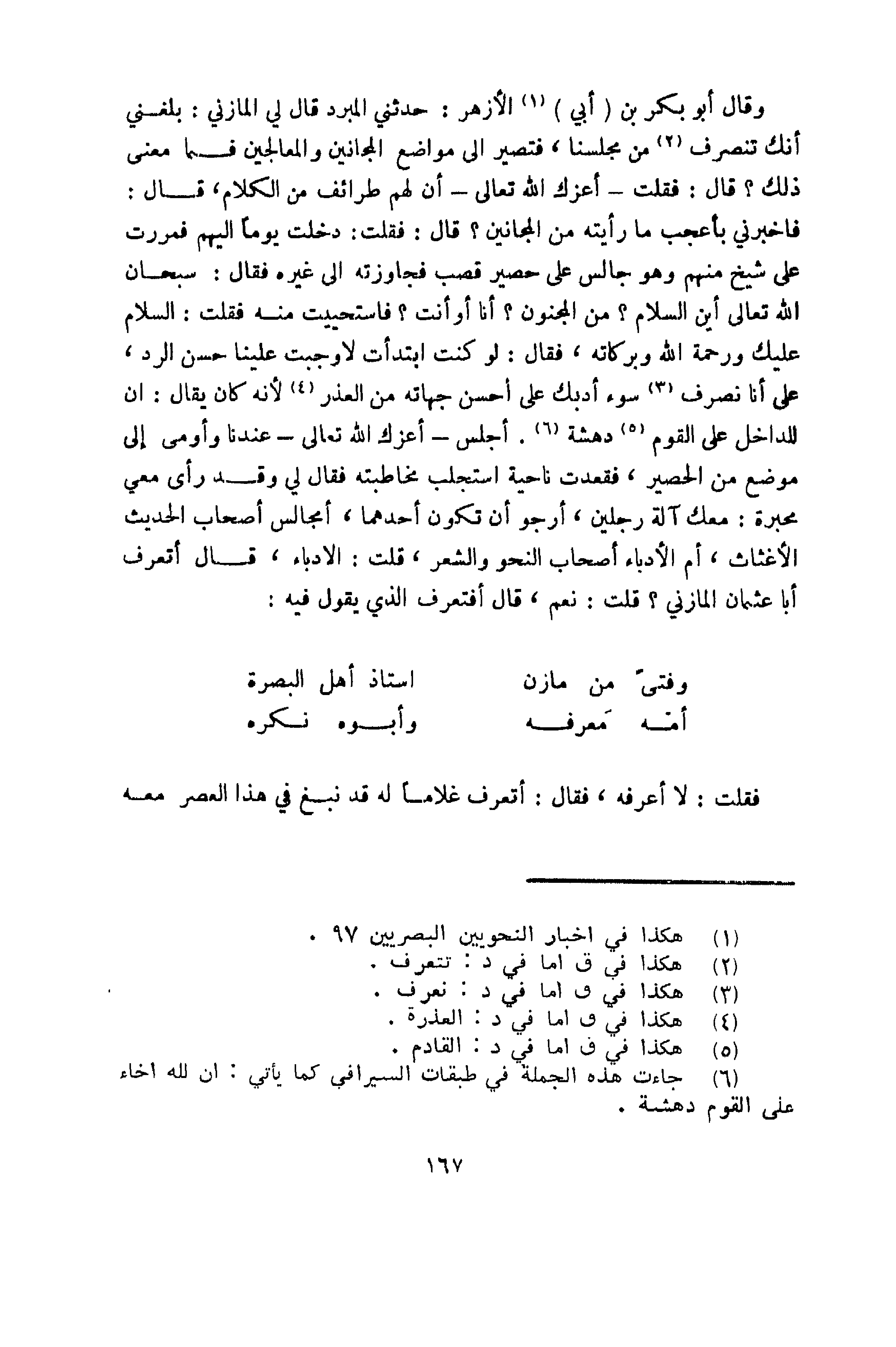 وقال أبو بكر بن الأزهر: حدثني محمد بن يزيد المبرد، قال: قال لي المازني: بلغني أنك تنصرف من مجلسنا فتصير إلى مواضع المجانين والمعالجين، فما معنى ذلك؟ قال: فقلت: أعزك الله تعالى! إن لهم طرائف من الكلام، قال: فأخبرني بأعجب ما رأيته من المجانين، قال: فقلت: دخلت يوماً إليهم، فمررت على شيخ منهم وهو جالس على حصير قصب، فجاورته إلى غيره، فقال: سبحان الله تعالى! أين السلام! مَن المجنون؟ أنا أم أنت! فاستحييت منه، فقلت: السلام عليكم ورحمة الله وبركاته، فقال: لو كنت ابتدأت لأوجبت علينا [حسن] الرد؛ على أنا نصرف سوء أدبك على أحسن جهاته من العذر؛ لأنه كان يقال: [إن] للداخل على القوم دهشة؛ اجلس أعزك الله تعالى عندنا! وأومأ إلى موضع من الحصير، فقعدت ناحية استجلب مخاطبته، فقال لي: وقد رأى معي مجبرة: أرى معك آلة رجلين، أرجو أن تكون أحدهما، تجالس أصحاب الحديث الأخفاف، أو الأدباء أصحاب النحو والشعر؟ قلت: الأدباء، قال: أتعرف أبا عثمان المازني؟ قلت: نعم، قال: أتعرف الذي يقول فيه: