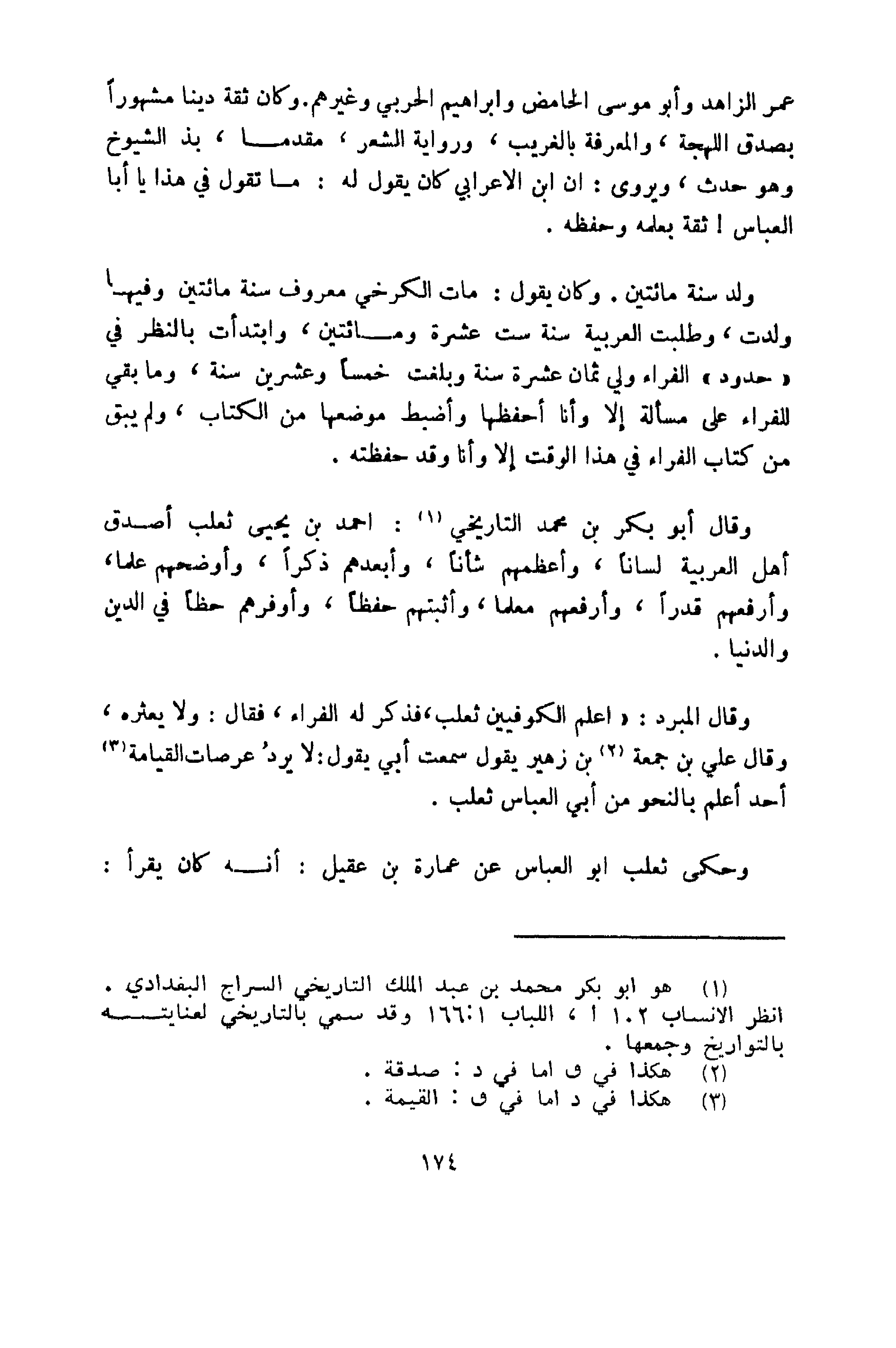 وقال المبرد: أعلم الكوفيين ثعلب، فذكر [له] الفراء، فقال: لا يعشره.
