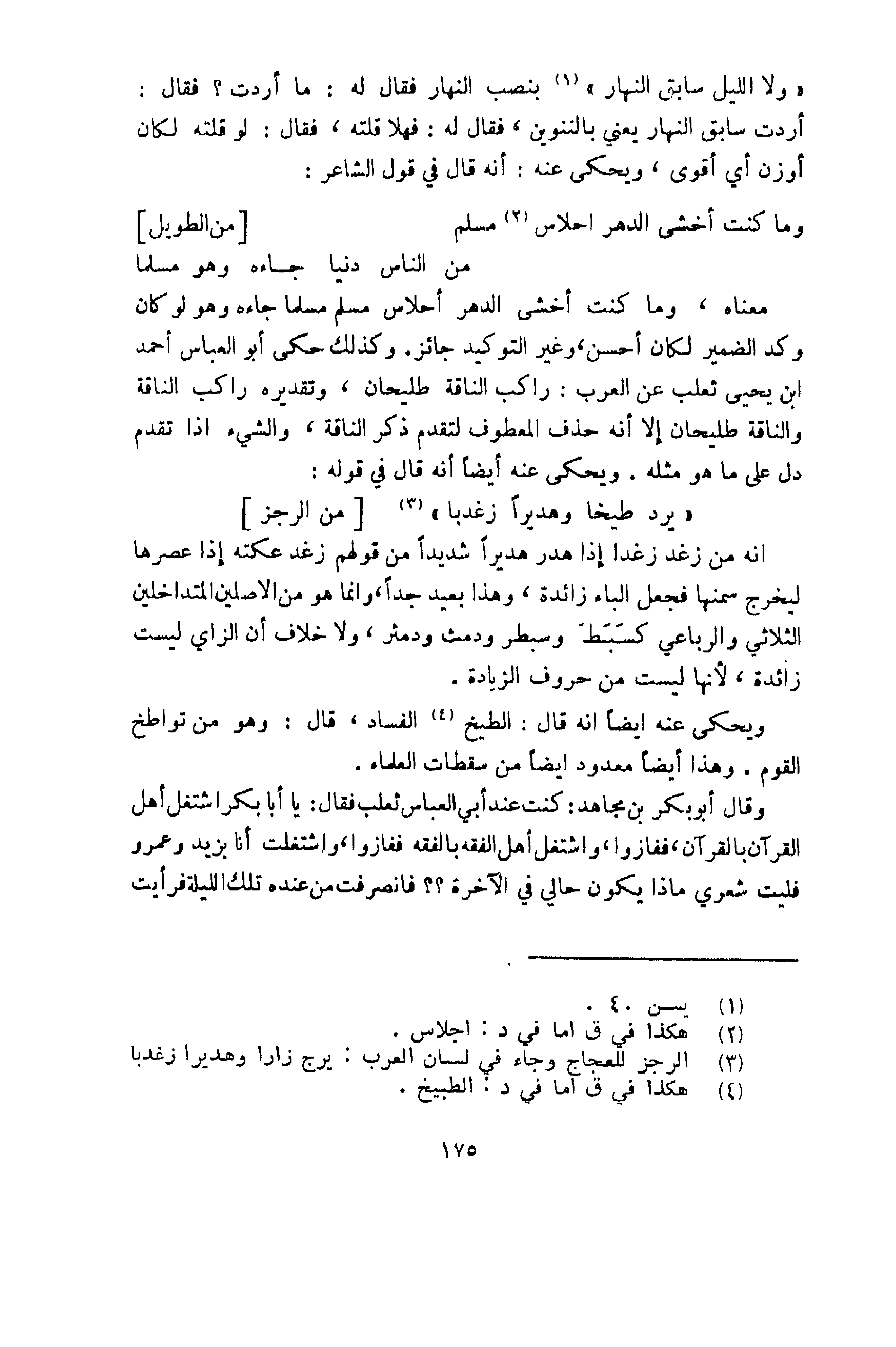 ولا الليل سابق النهار [بنصب "النهار"، فقال: ما أردت؟ فقال: أردت "سابقٌ النهار" يعني بالتنوين؛ فقال له: فهلا قلته؟ فقال: لو قلته لكان أوزن، أي أقوى.