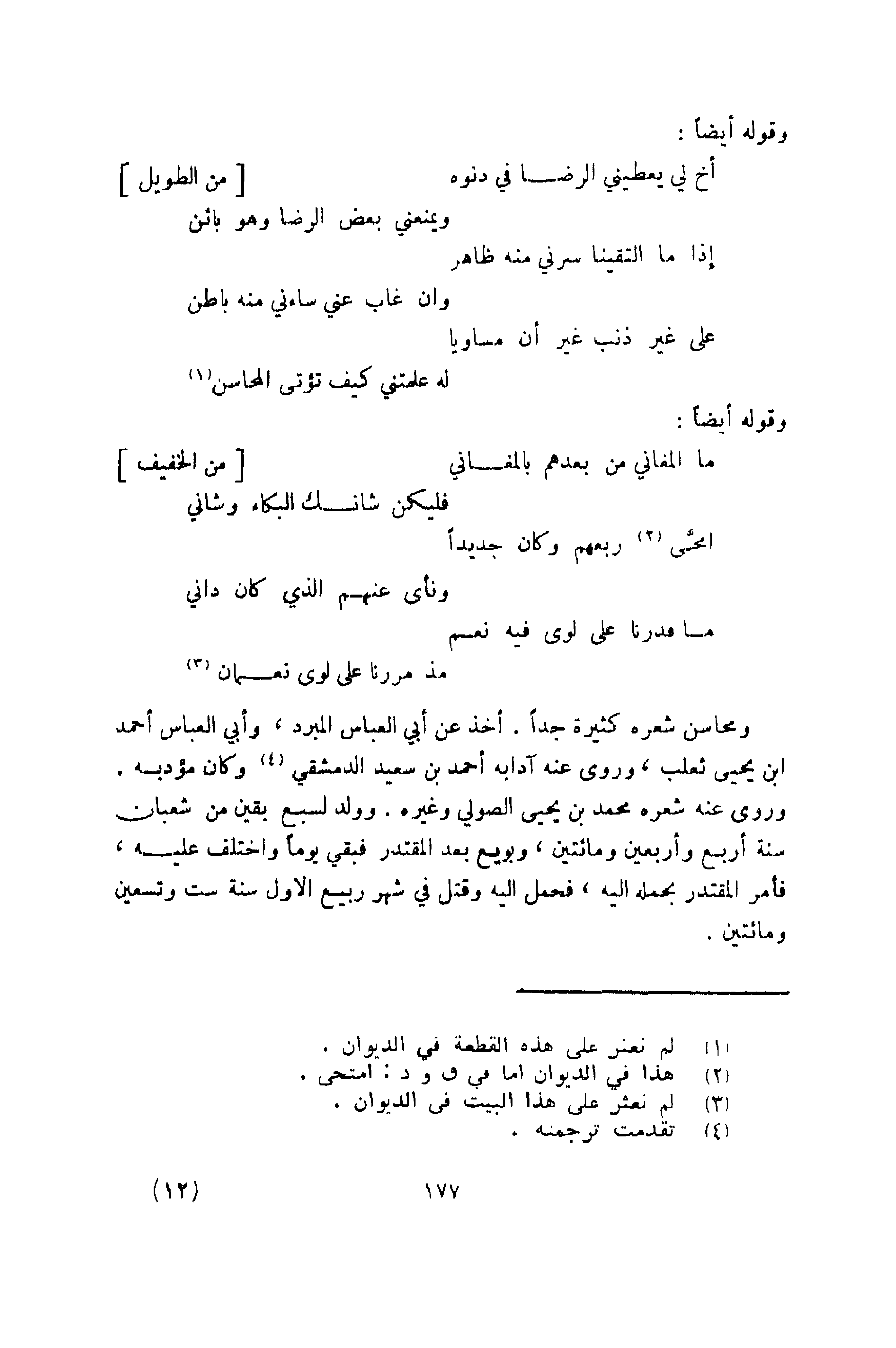 امحى ربعهم وكان جديداً=ونأى عنهم الذي كان دان ما مررنا على لوًى فيه نعم=مذ مررنا على لوَى نعمان ومحاسن شعره كثيرة [جداً] .