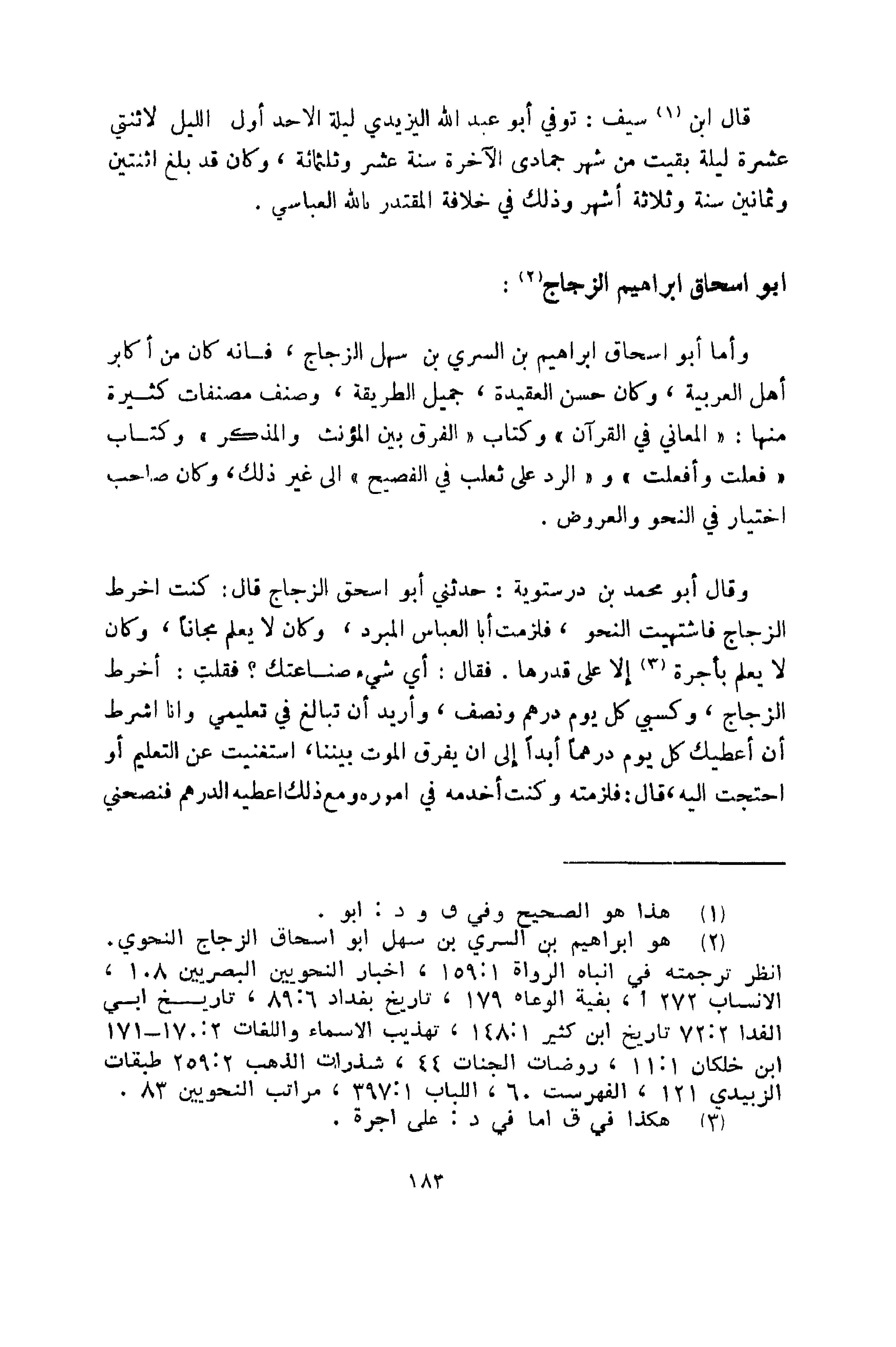 وأما أبو إسحاق إبراهيم بن السري بن سهل الزجاج؛ فإنه كان من أكابر أهل العربية، وكان حسن العقيدة، جميل الطريقة.