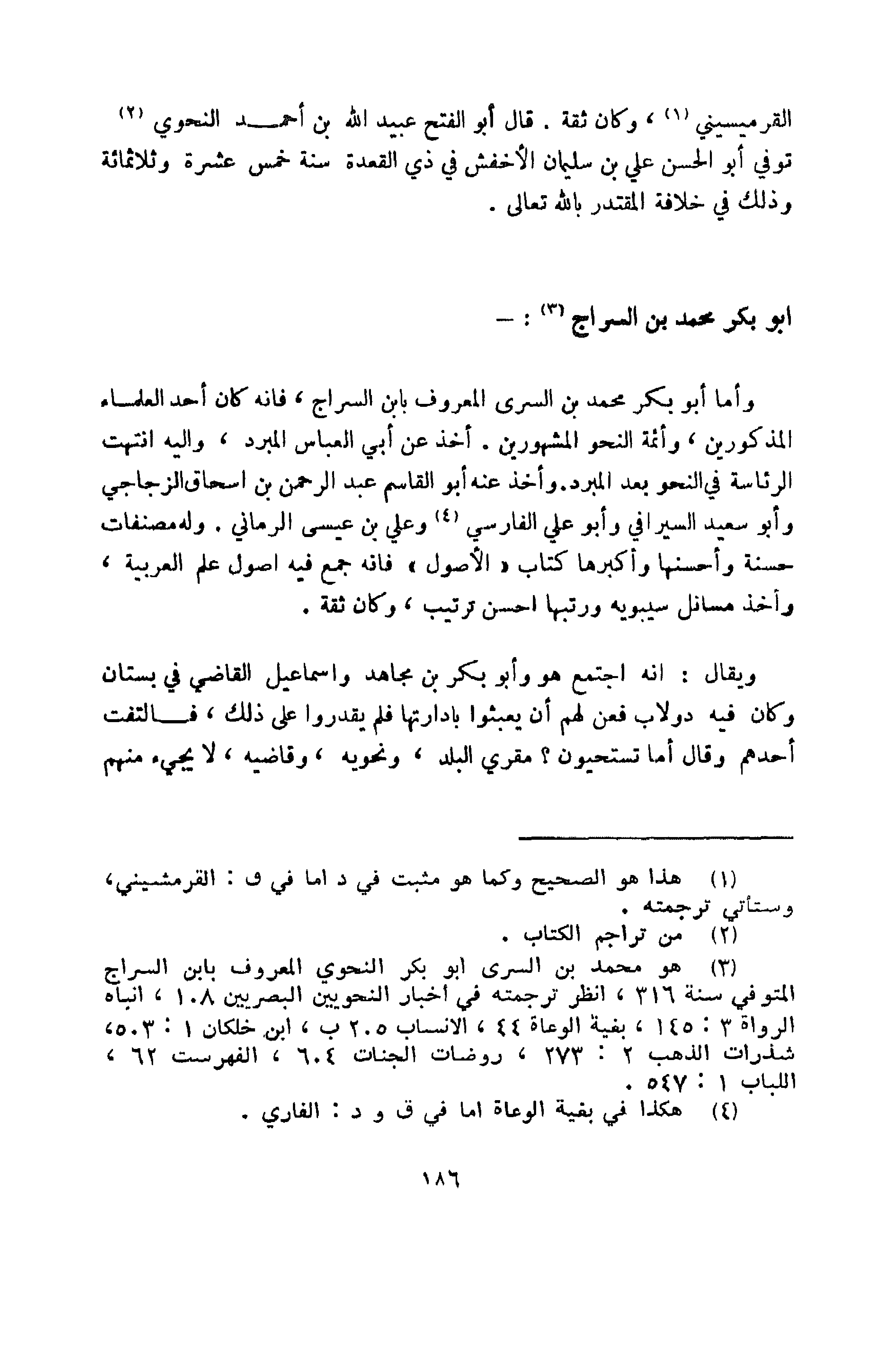 وأما أبو بكر محمد بن السري المعروف بابن السراج، فإنه كان أحد العلماء المذكورين، وأئمة النحو المشهورين. أخذ عن أبي العباس المبرد، وإليه انتهت الرياسة في النحو بعد المبرد، وأخذ عنه أبو القاسم عبد الرحمن بن إسحاق الزجاجي، وأبو سعيد السيرافي، وأبو علي الفارسي، وعلي بن عيسى الرماني.