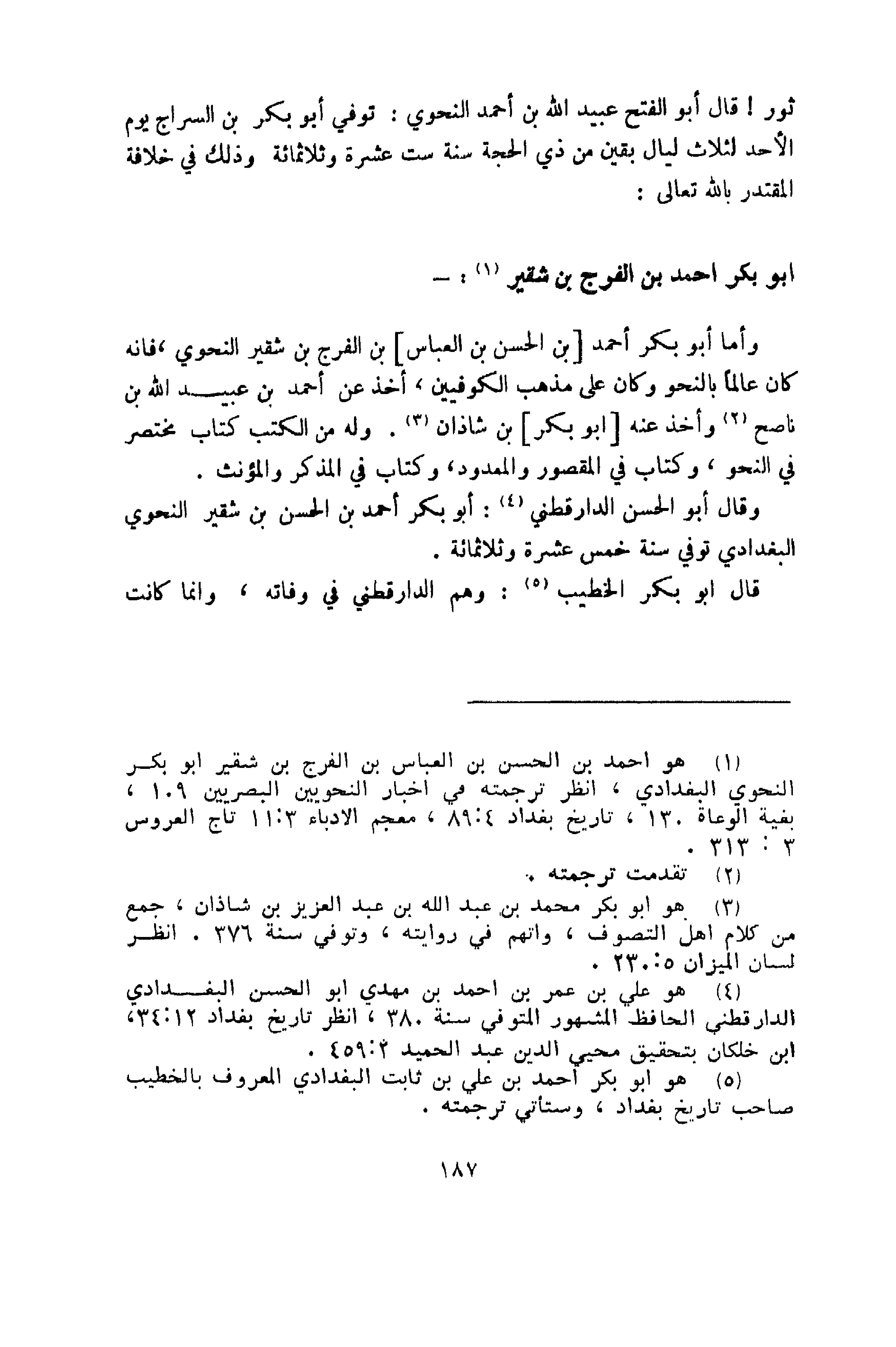 وقال أبو الحسن الدارقطني: أبو بكر أحمد بن الحسن بن شقير النحوي بغدادي، توفي سنة خمس عشرة وثلثمائة.