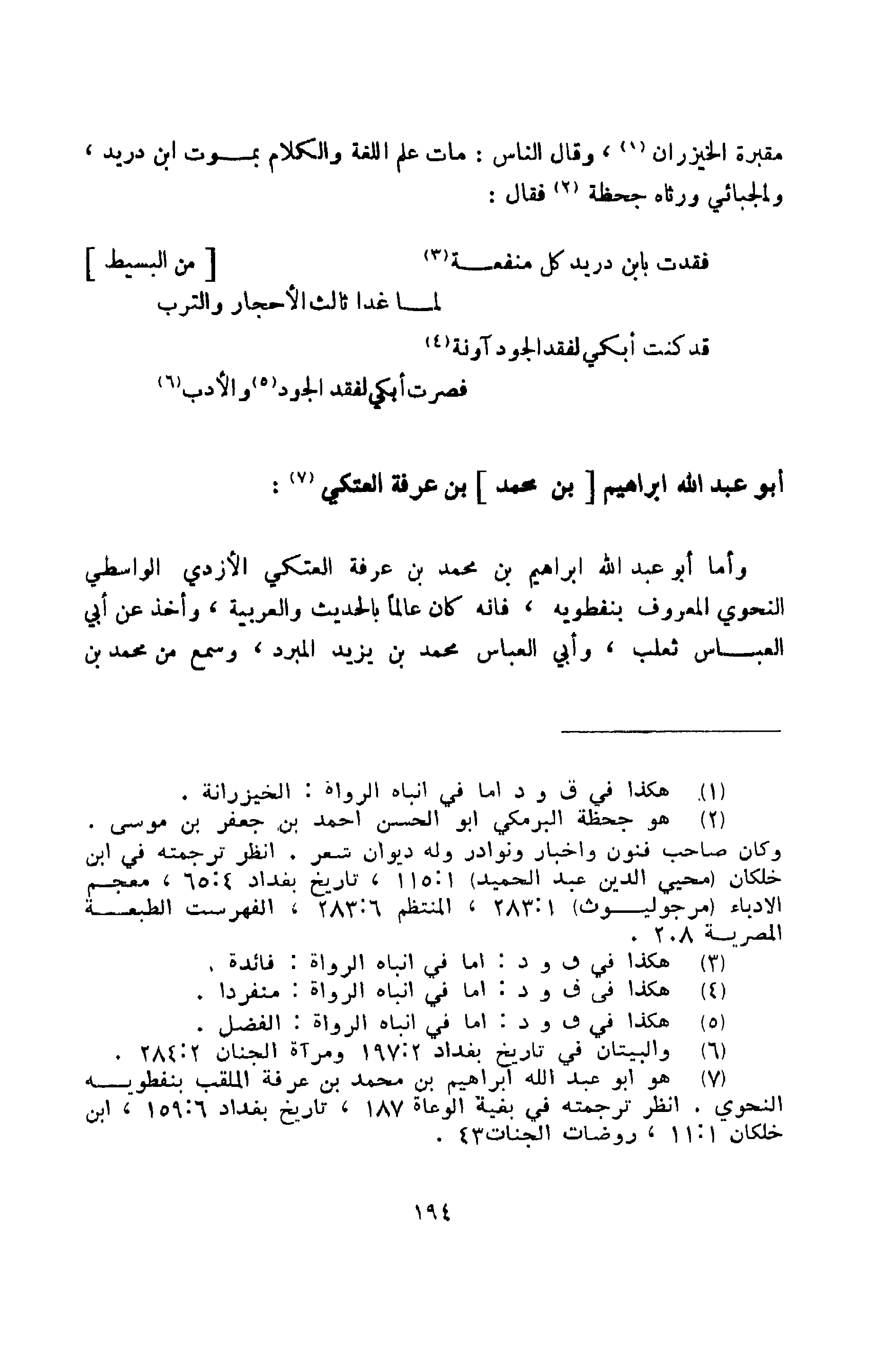 وأما أبو عبد الله إبراهيم بن محمد بن عرفة العنكي الأزدي الواسطي المعروف بنفطويه، فإنه كان عالماً بالحديث والعربية، وأخذ عن أبي العباس ثعلب وأبي العباس محمد بن يزيد المبرد، وسمع من محمد بن