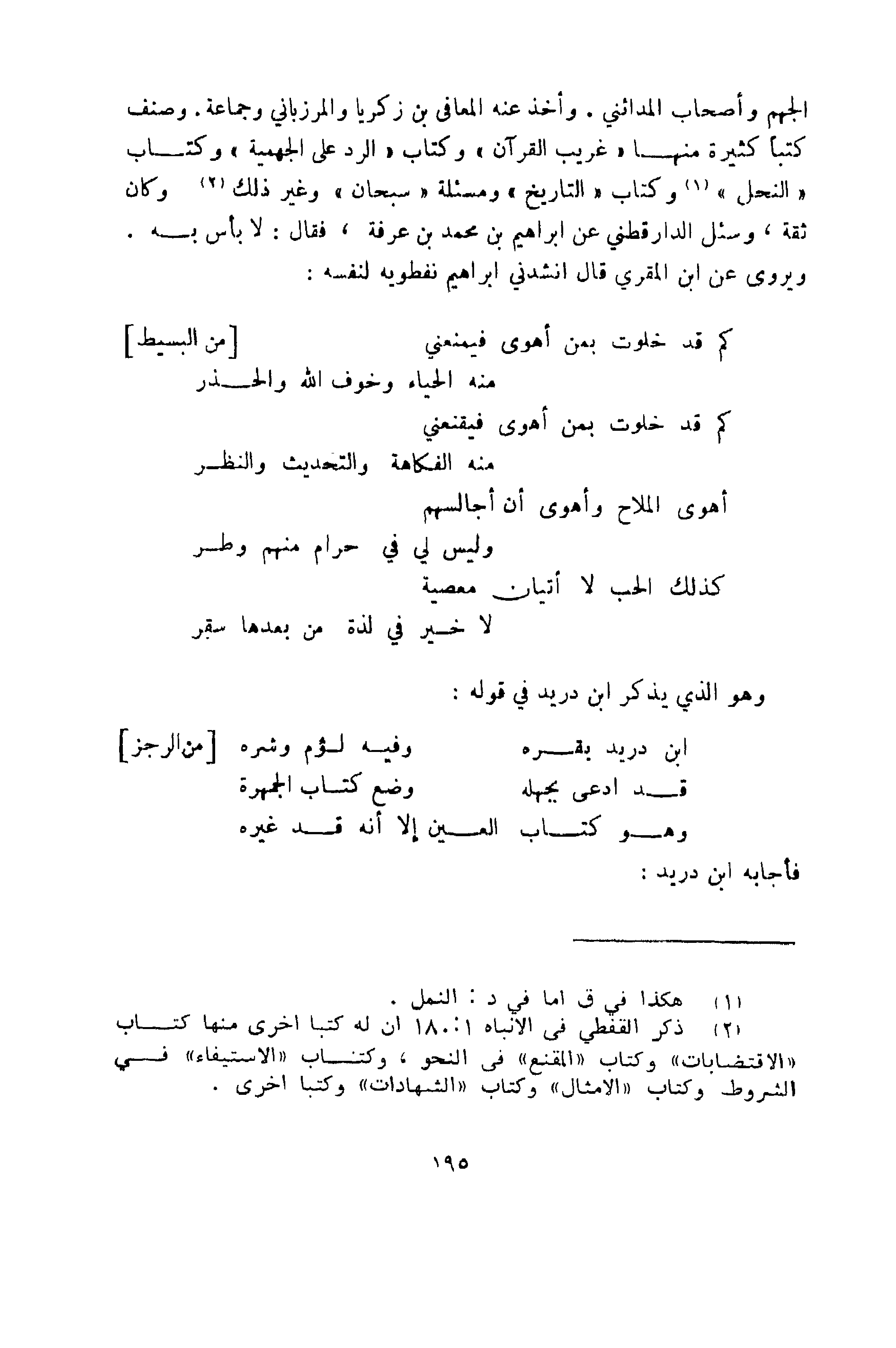 وسئل أبو الحسن الدارقطني عن إبراهيم بن محمد بن عرفة، فقال: لا بأس به، ويروى عن أبي المقرئ، قال: أنشدني إبراهيم نفطويه لنفسه: