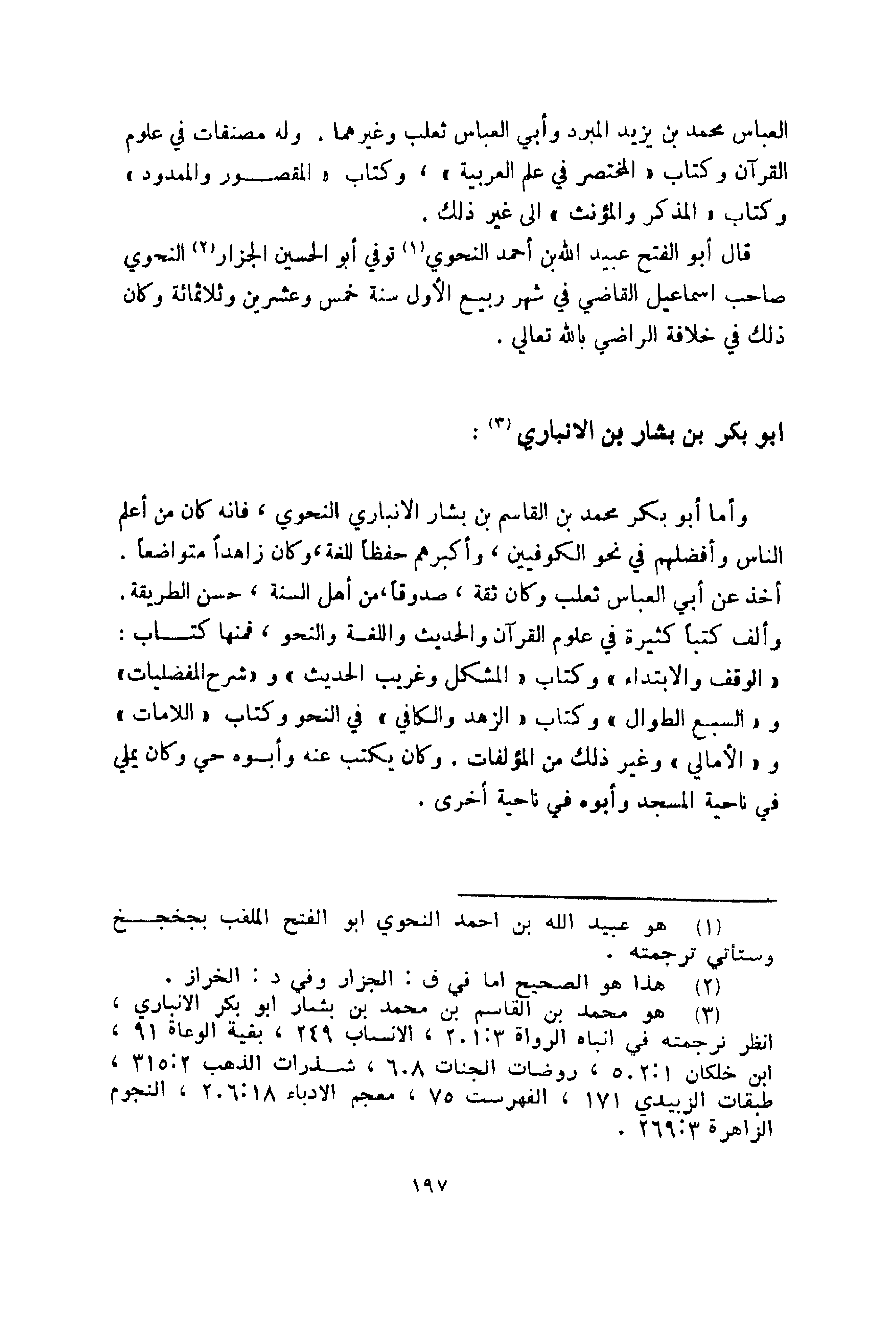 وأما أبو بكر محمد بن القاسم بشار الأنباري النحوي، فإنه كان من أعلم الناس وأفضلهم في نحو الكوفيين، وأكثرهم حفظاً للغة؛ وكان زاهداً متواضعاً. أخذ عن أبي العباس ثعلب.