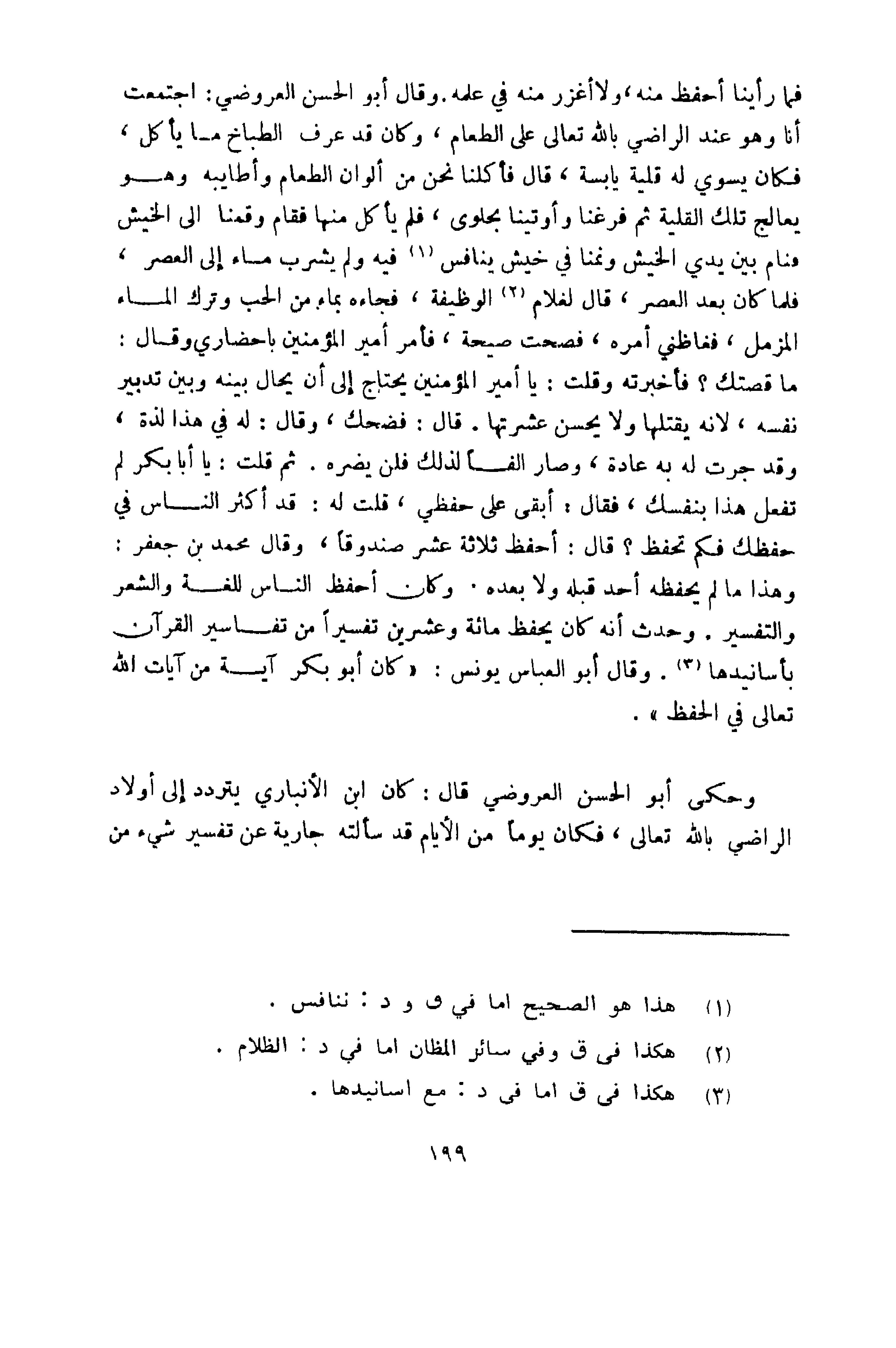 وقال أبو الحسن العروضي: اجتمعت أنا وهو عند الراضي بالله على الطعام، وكان قد عرف الطباخ ما يأكل، فكان يسوي له قلية يابسة. قال: فأكلنا نحن من ألوان الطعام وأطايبه، وهو يعالج تلك القلية، ثم فرغنا وأتينا بحلوى، فلم يأكل منها، فقام وقمنا إلى الخيش، فنام بين يدي الخيش، ونمنا في خيش ينافس فيه، فلم يشرب ماء إلى العصر، فلما كان بعد العصر، قال: يا غلام الوظيفة! فجاءه بماء من الحب، وترك الماء المزمل [بالثلج] ، فغاظني أمره، فصحت صيحة: يا أمير المؤمنين! فأمر بإحضاري، وقال: ما قصتك؟ فأخبرته، وقلت: يا أمير المؤمنين، يحتاج [هذا] إلى أن يحال بينه وبين تدبير نفسه، لأنه يقتلها ولا يحسن عشرتها، فضحك وقال: له في هذه لذة، وقد جرت له به عادة، وصار آلفاً لذلك فلن يضره. ثم قلت: يا أبا بكر، لم تفعل هذا بنفسك؟ فقال: أبقي على حفظي، قلت له: قد أكثر الناس في حفظك، فكم تحفظ؟ فقال: أحفظ ثلاثة عشر صندوقاً.