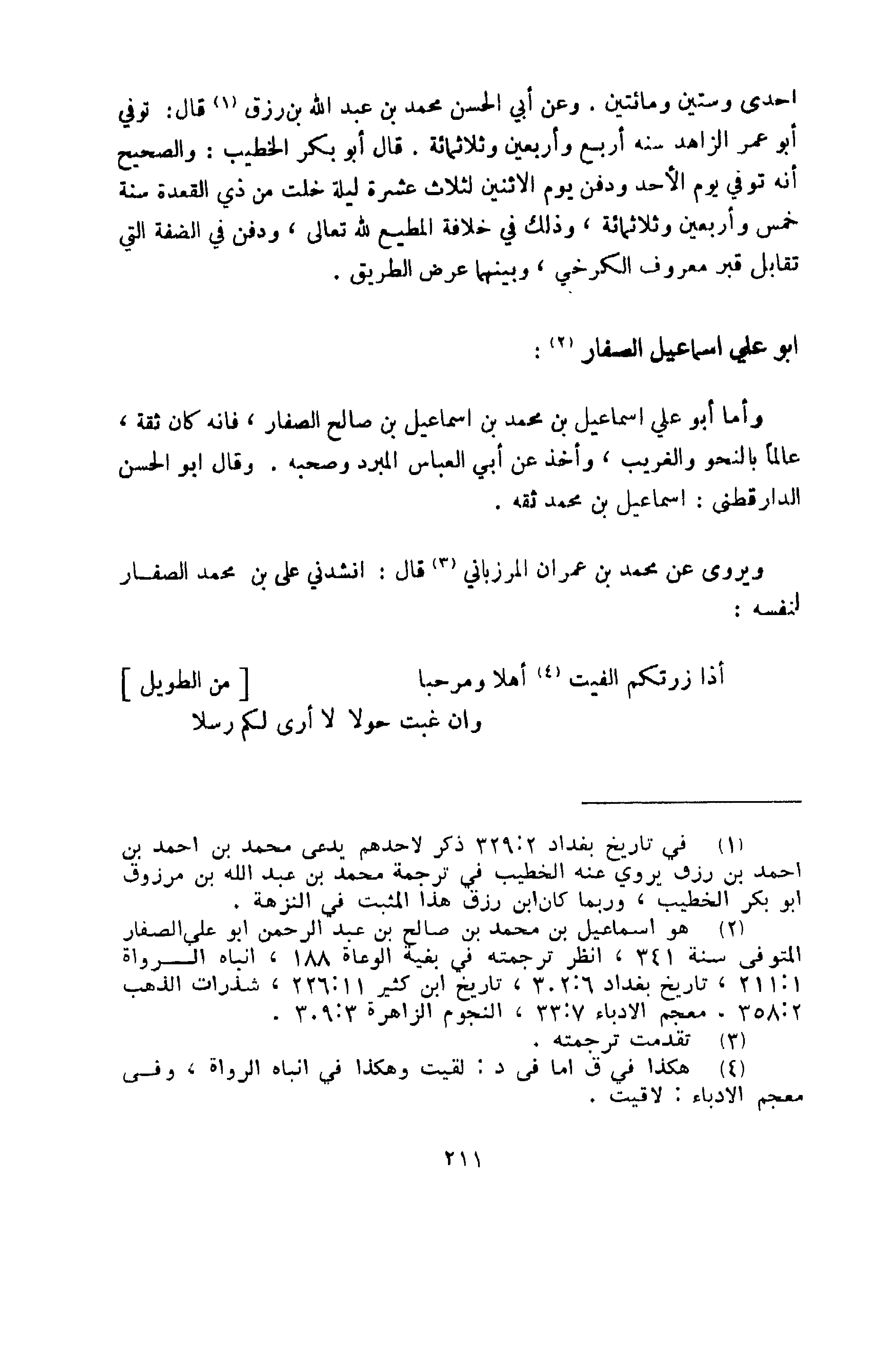 وأما أبو علي إسماعيل بن محمد بن إسماعيل بن صالح الصفار، فإنه كان ثقة عالماً بالنحو والغريب، وأخذ عن أبي العباس المبرد وصحبه. وقال أبو الحسن الدارقطني: إسماعيل بن محمد ثقة.