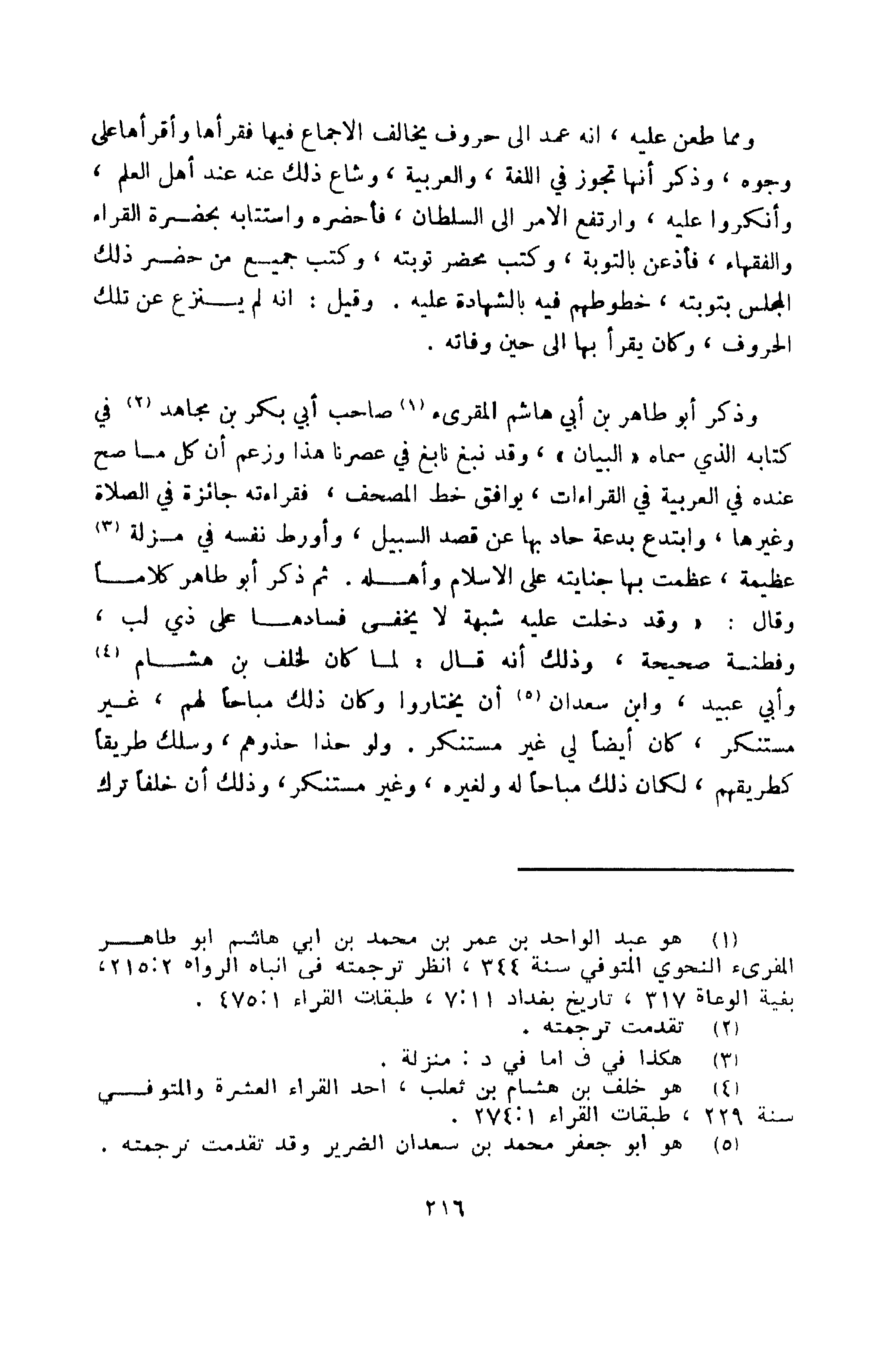 ذكر أبو طاهر بن أبي هاشم المقرئ، صاحب أبي بكر بن مجاهد، في كتابه الذي سماه "البيان" وقد نبغ نابغ في عصرنا هذا، وزعم أن كل ما صح عنده في العربية من القرآن يوافق خط المصحف، فقراءته جائزة في الصلاة وغيرها، وابتدع بدعة حاد بها عن قصد السبيل، وأورط نفسه في مزلة عظمت بها جنايته على الإسلام وأهله.