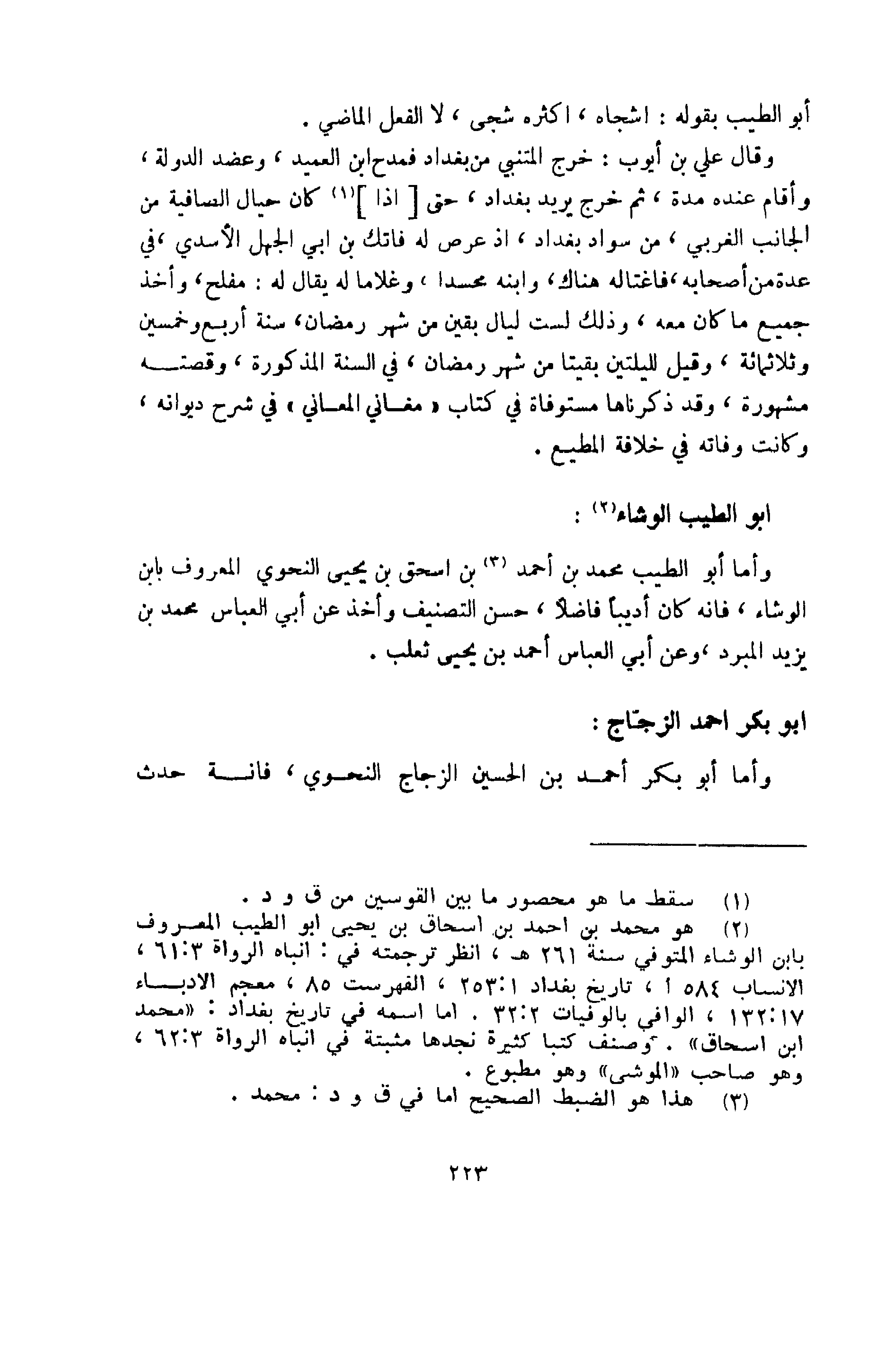 وأما أبو الطيب محمد بن أحمد بن إسحاق بن يحيى النحوي، المعروف بابن الوشاء، فإنه كان أديباً فاضلاً، حسن التصنيف، وأخذ عن محمد بن يزيد المبرد، وعن أحمد بن يحيى ثعلب.