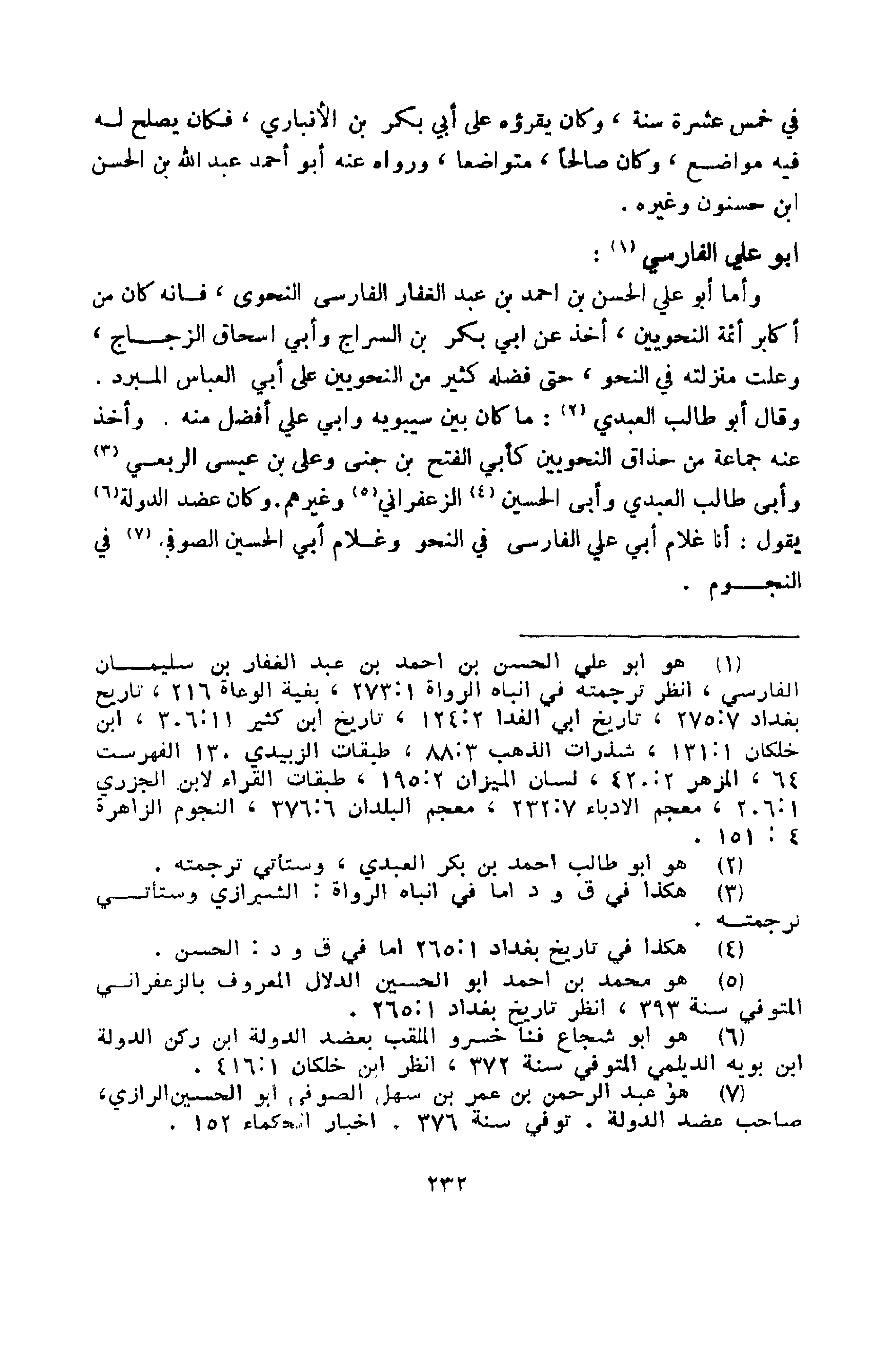 وأما أبو علي الحسن بن أحمد بن عبد الغفار الفارسي النحوي؛ فإنه كان من أكابر أئمة النحويين؛ أخذ عن أبي بكر بن السراج، وأبي إسحاق الزجاج؛ وعلت منزلته في النحو حتى فضله كثير من النحويين على أبي العباس المبرد.