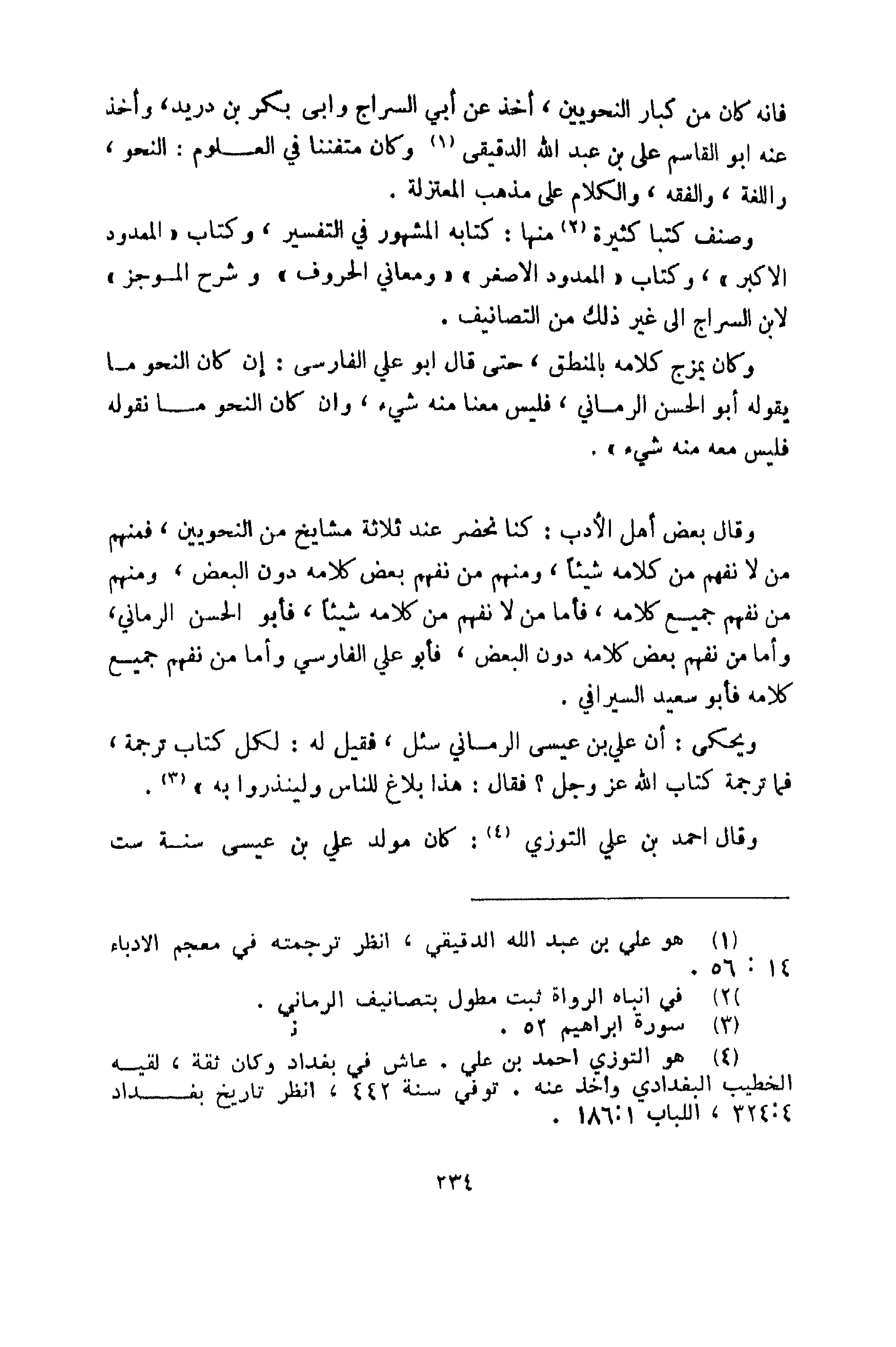 وقال بعض أهل الأدب: كنا نحضر عند ثلاثة مشايخ من النحويين؛ فمنهم من لا نفهم من كلامه شيئاً، ومنهم من نفهم بعض كلامه دون البعض، ومنهم من لا نفهم جميع كلامه، فأما من لا نفهم من كلامه شيئاً، فأبو الحسن الرماني، وأما من نفهم بعض كلامه دون البعض فأبو علي الفارسي، وأما من نفهم جميع كلامه فأبو سعيد السيرافي.