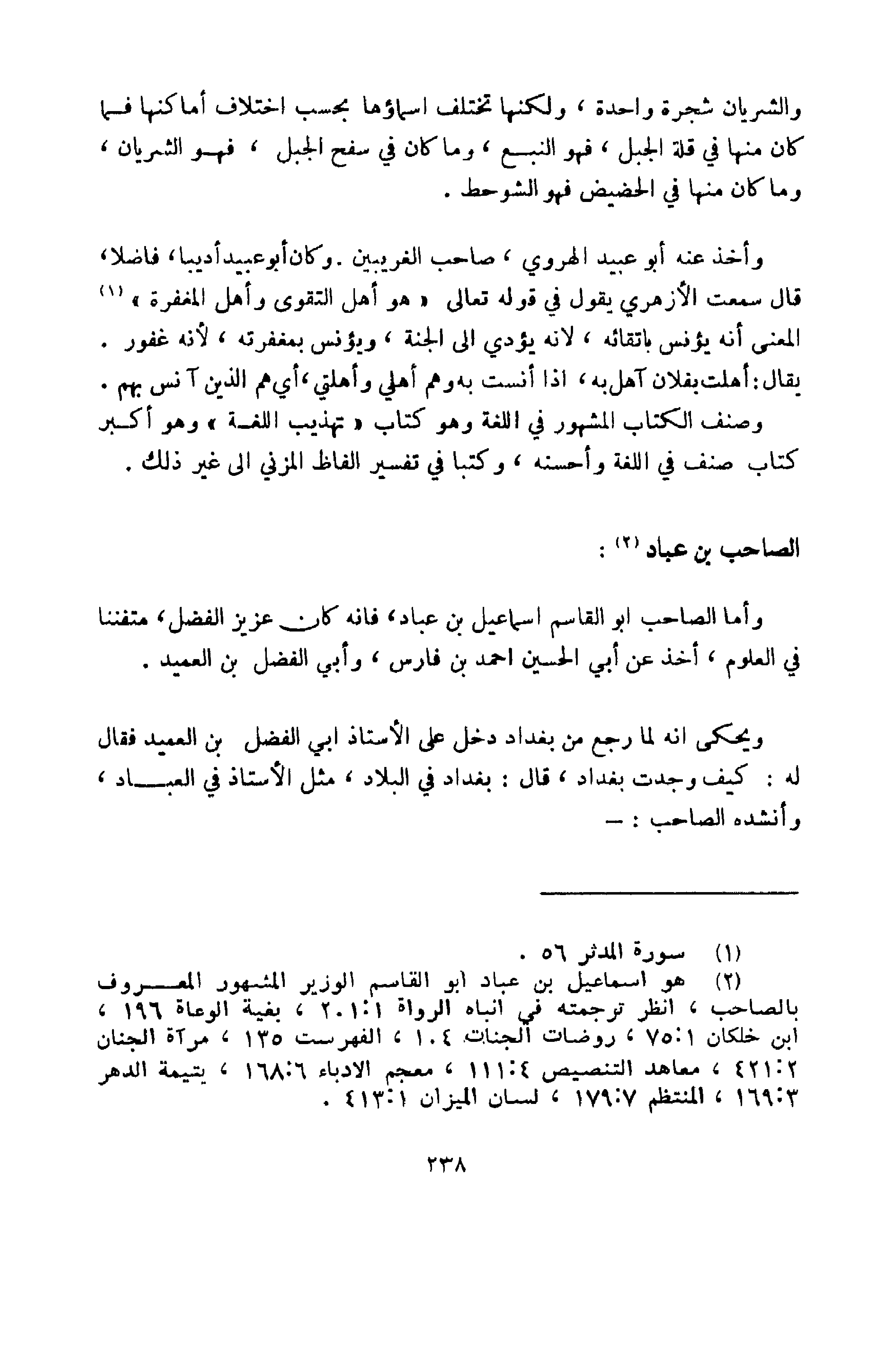 وأما الصاحب أبو القاسم إسماعيل بن عباد، فإنه كان غزير الفضل، متفنناً في العلوم، أخذ عن أبي الحسين بن فارس، وأبي الفضل بن العميد.
