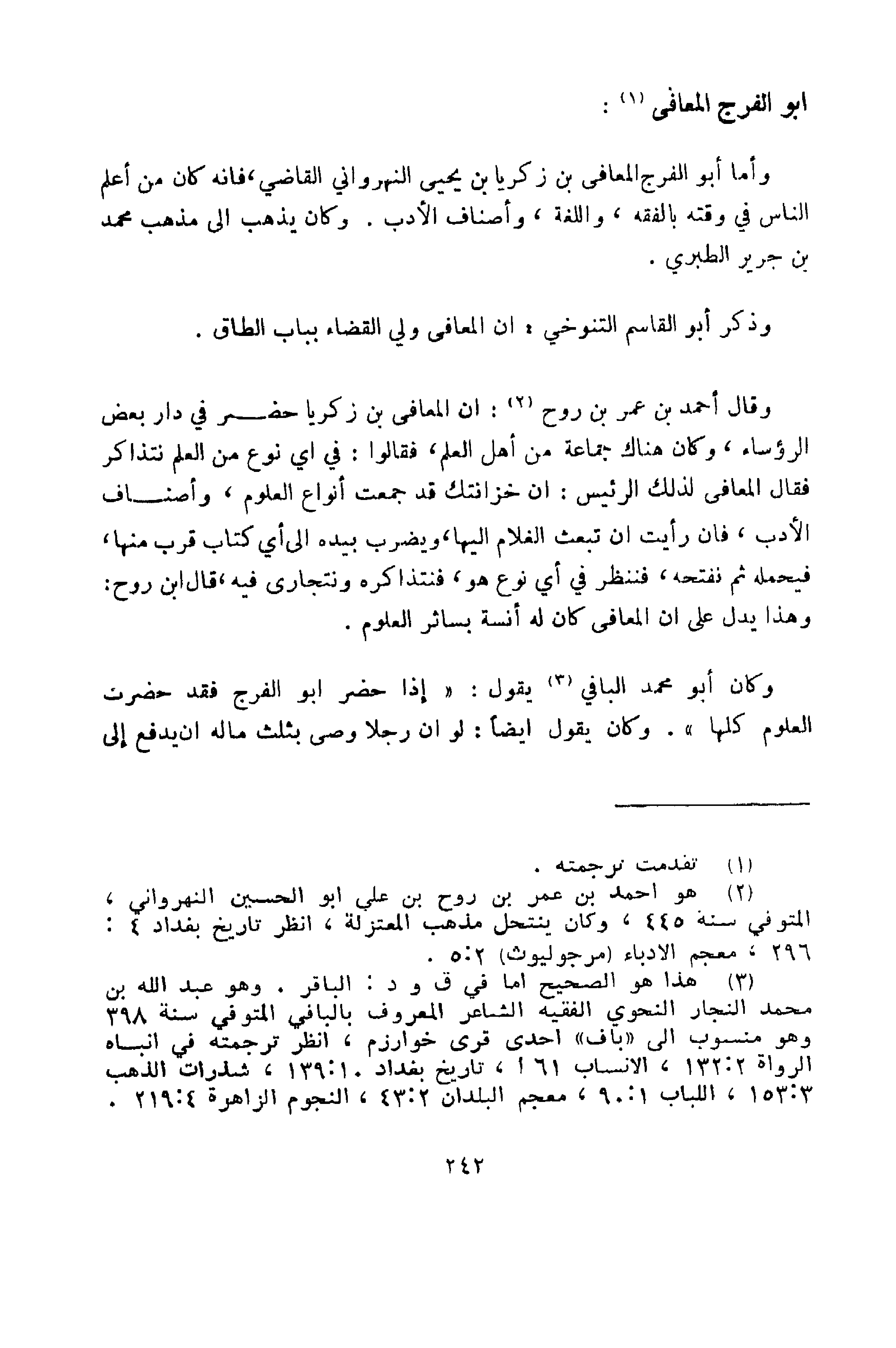 وأما أبو الفرج بن زكرياء بن يحيى النهرواني القاضي، فإنه كان من أعلم الناس في وقته بالفقه، والنحو، واللغة، وأصناف الأدب، وكان يذهب إلى مذهب محمد بن جرير الطبري.