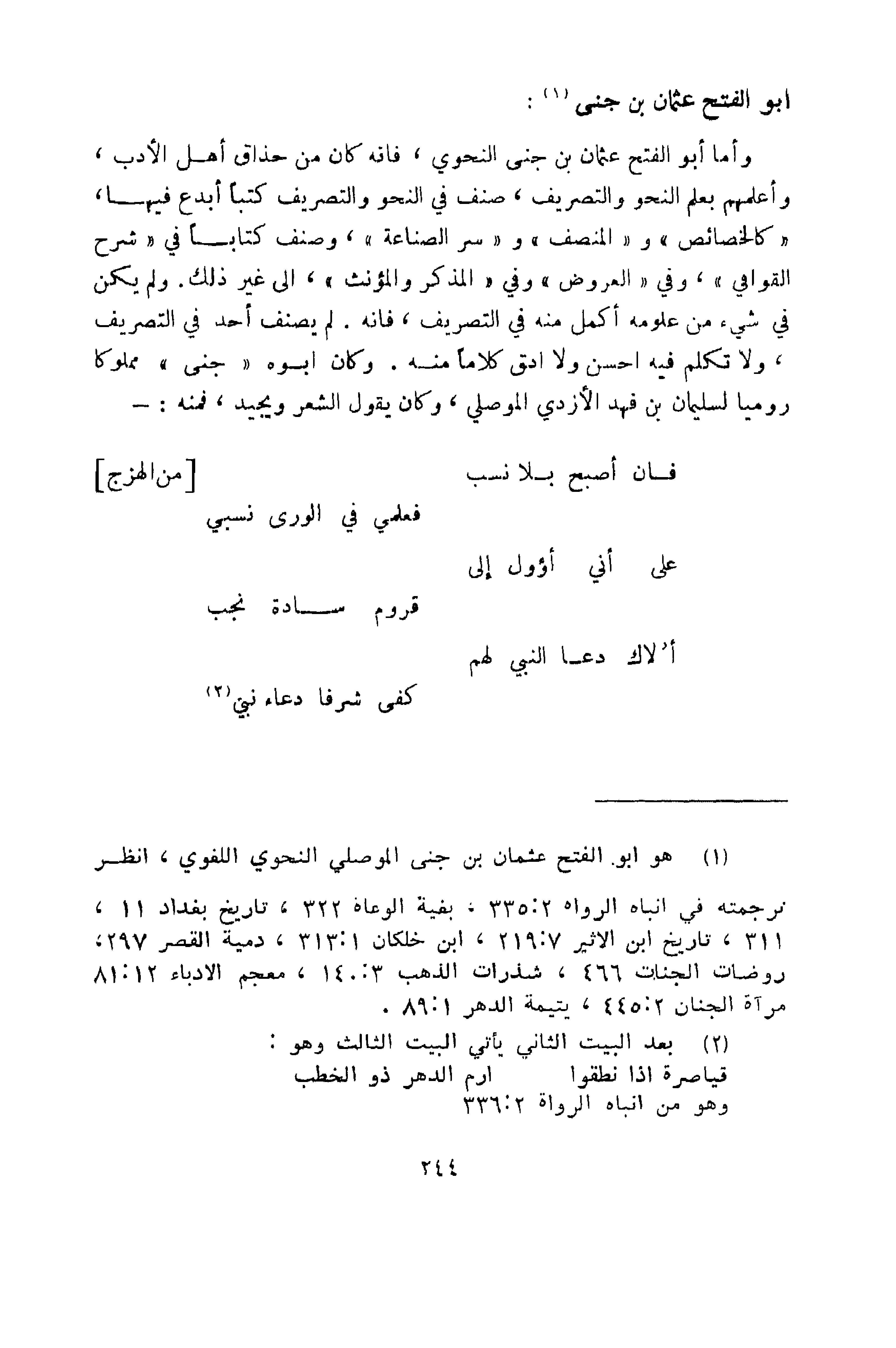 وأما أبو الفتح عثمان بن جني النحوي، فإنه كان من حذاق أهل الأدب، وأعلمهم بعلم النحو والتصريف.