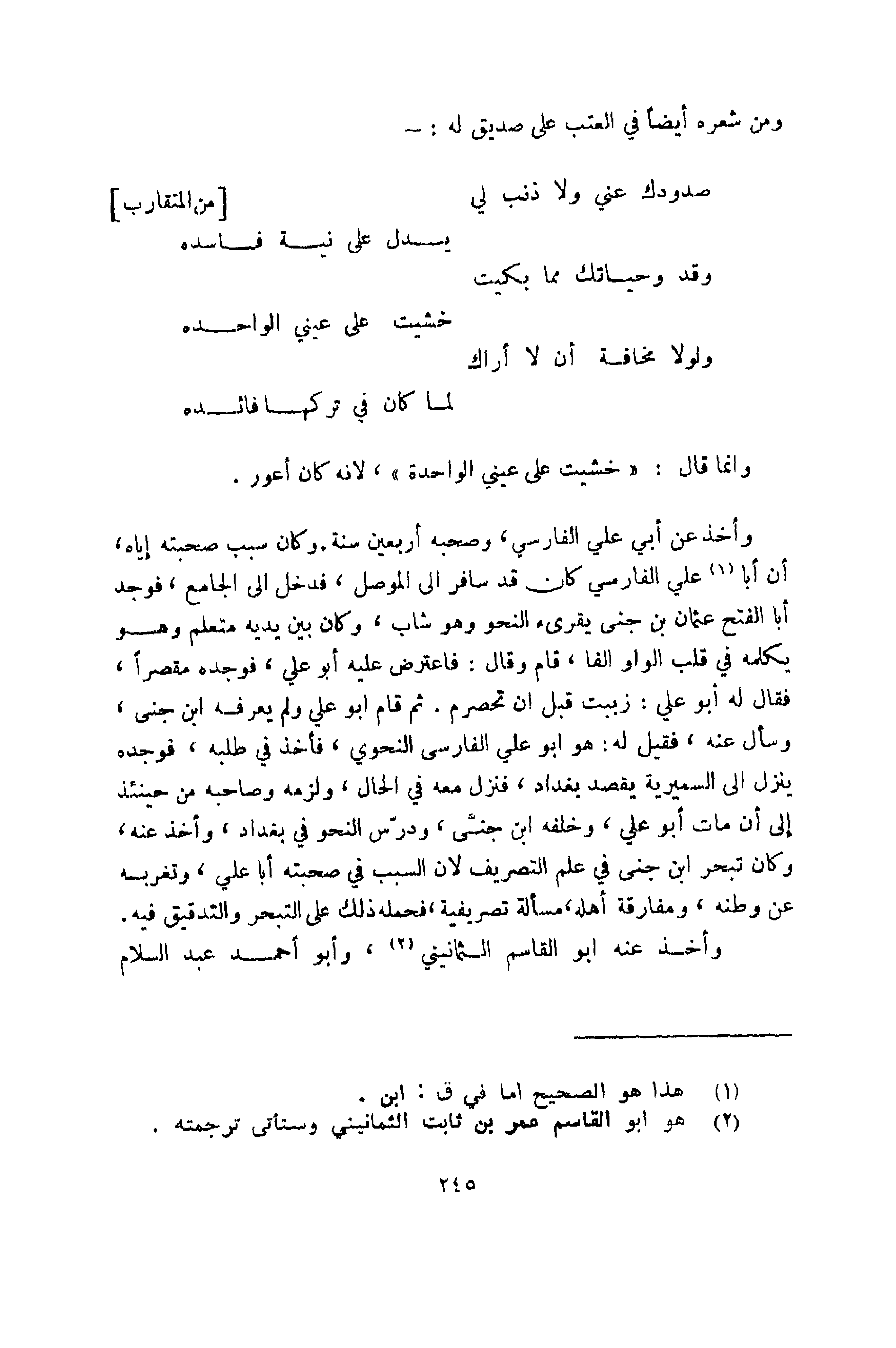 وأخذ عن أبي علي الفارسي؛ وصحبه أربعين سنة وكان سبب صحبته إياه أن أبا علي الفارسي كان قد سافر إلى الموصل، فدخل إلى الجامع، فوجد أبا الفتح عثمان بن جني يقرأ النحو وهو شاب، وكان بين يديه متعلم وهو يكلمه في قلب الواو ألفاً، نحو "قام" و"قال"، فاعترض عليه أبو علي، فوجه مقصراً، فقال له أبو علي: زببت قبل أن تحصرم، ثم قام أبو علي ولم يعرفه ابن جني، فسأل عنه، فقيل له: هذا أبو علي الفارسي النحوي، فأخذ في طلبه، فوجده ينزل إلى السميرية، يقصد بغداد، فنزل معه في الحال، ولزمه وصاحبه من حينئذ إلى أن مات أبو علي وخلفه ابن جني، ودرس النحو ببغداد بعده، وأخذ عنه، وكان تبحر ابن جني في علم التصريف؛ لأن السبب في صحبته أبا علي وتغربه عن وطنه، ومفارقة أهله مسألة تصريفية، فحمله ذلك على التبحر والتدقيق فيه.