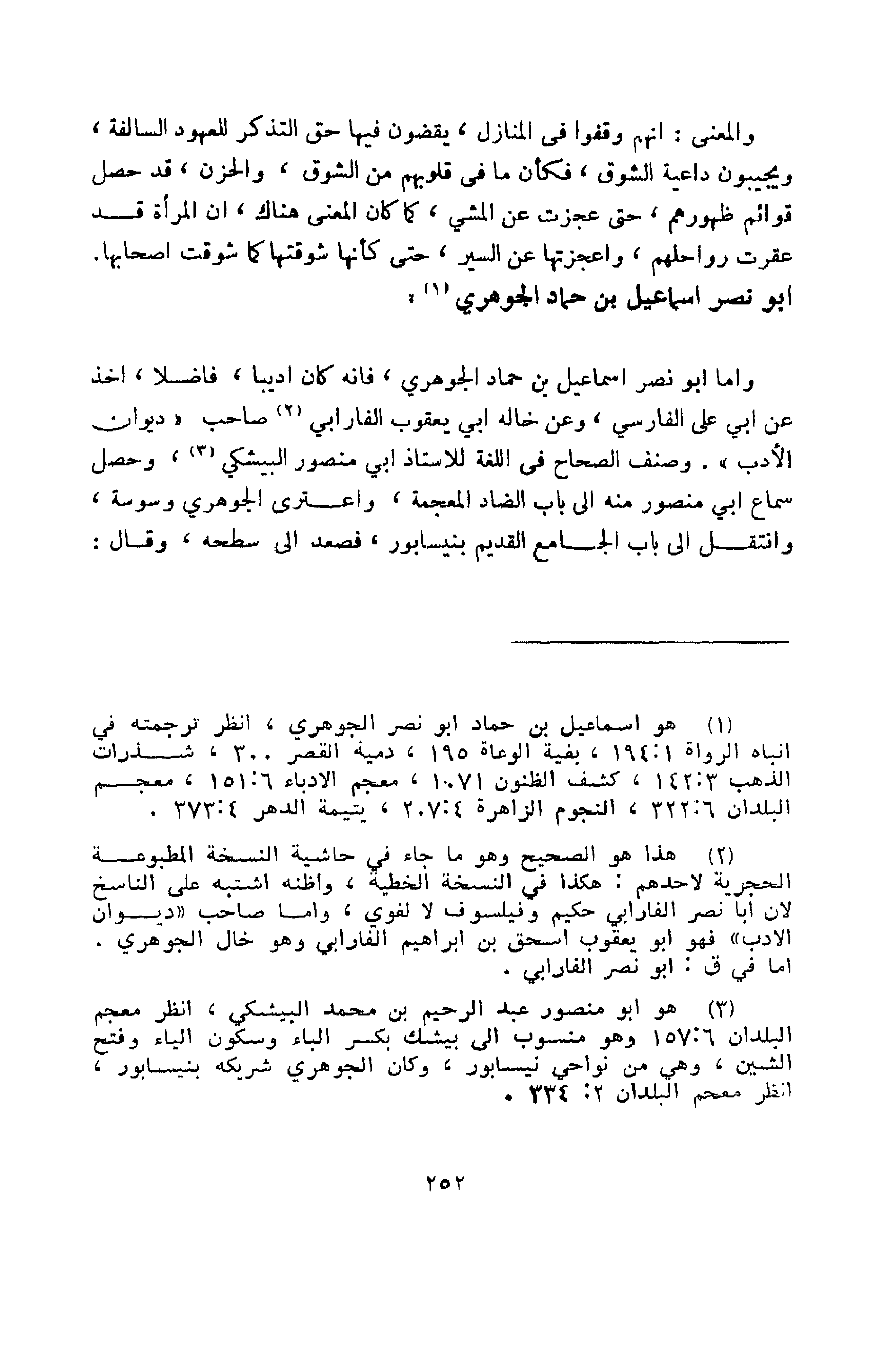وأما أبو نصر إسماعيل بن حماد الجوهري، فإنه كان أديباً فاضلاً، أخذ عن أبي علي الفارسي، وعن خاله أبي إبراهيم الفارابي صاحب ديوان الأدب.