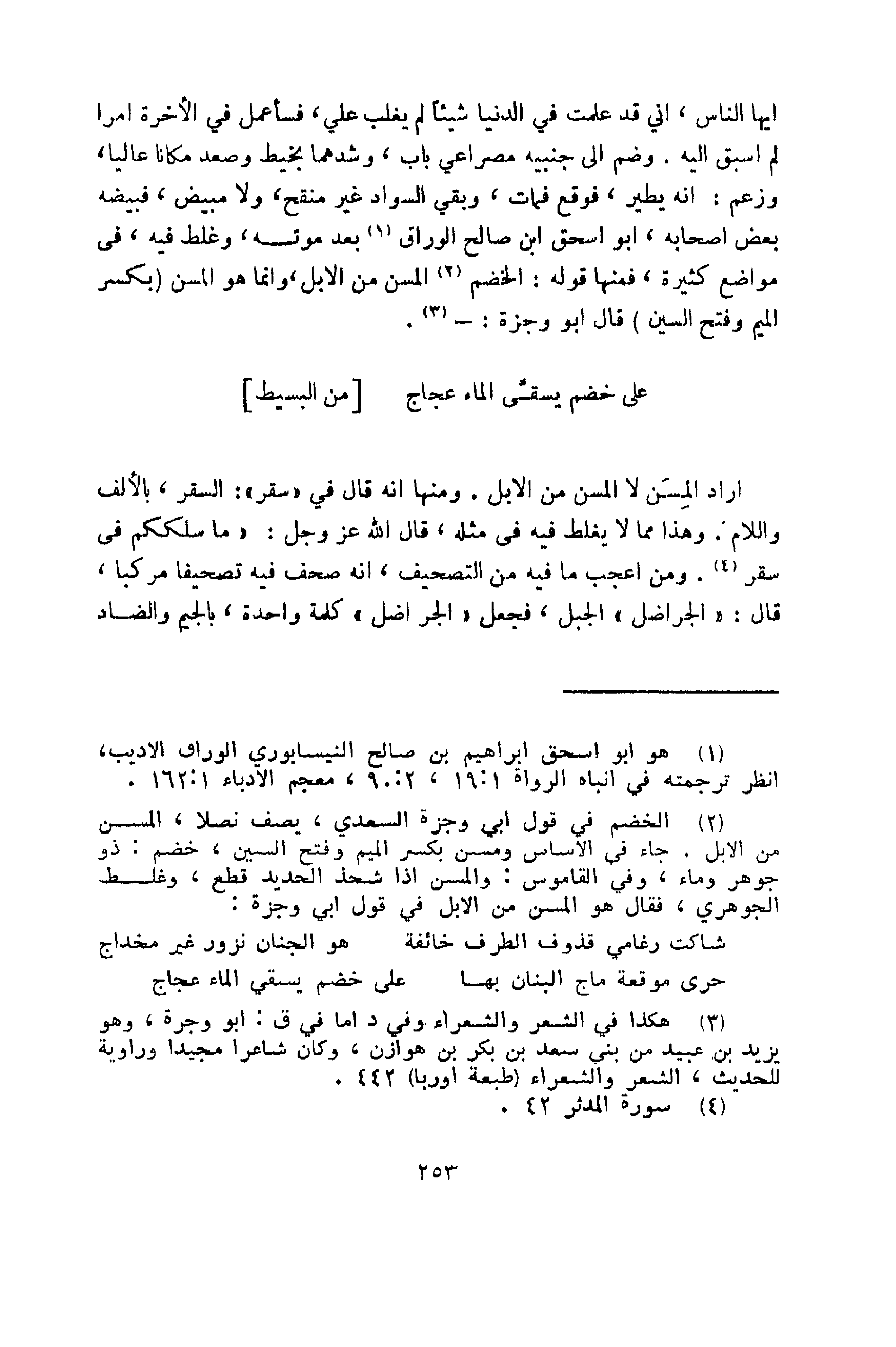 أيها الناس، إني قد عملت في الدنيا شيئاً لم يغلب عليّ، فسأعمل في الآخرة أمراً لم أسبق إليه. وضم إلى جنبيه مصراعي باب، وشدهما بخيط، وصعد مكاناً عالياً، وزعم أنه يطير، فوقع فمات، وبقي الكتاب غير منقح ولا مبيض، فبيضه بعض أصحابه؛ أبو إسحاق ابن صالح الوراق بعد موته، وغلط فيه في مواضع كثيرة، فمنها قوله: الخضم: المسن من الإبل، وإنما هو المسن، قال أبو وجزة: