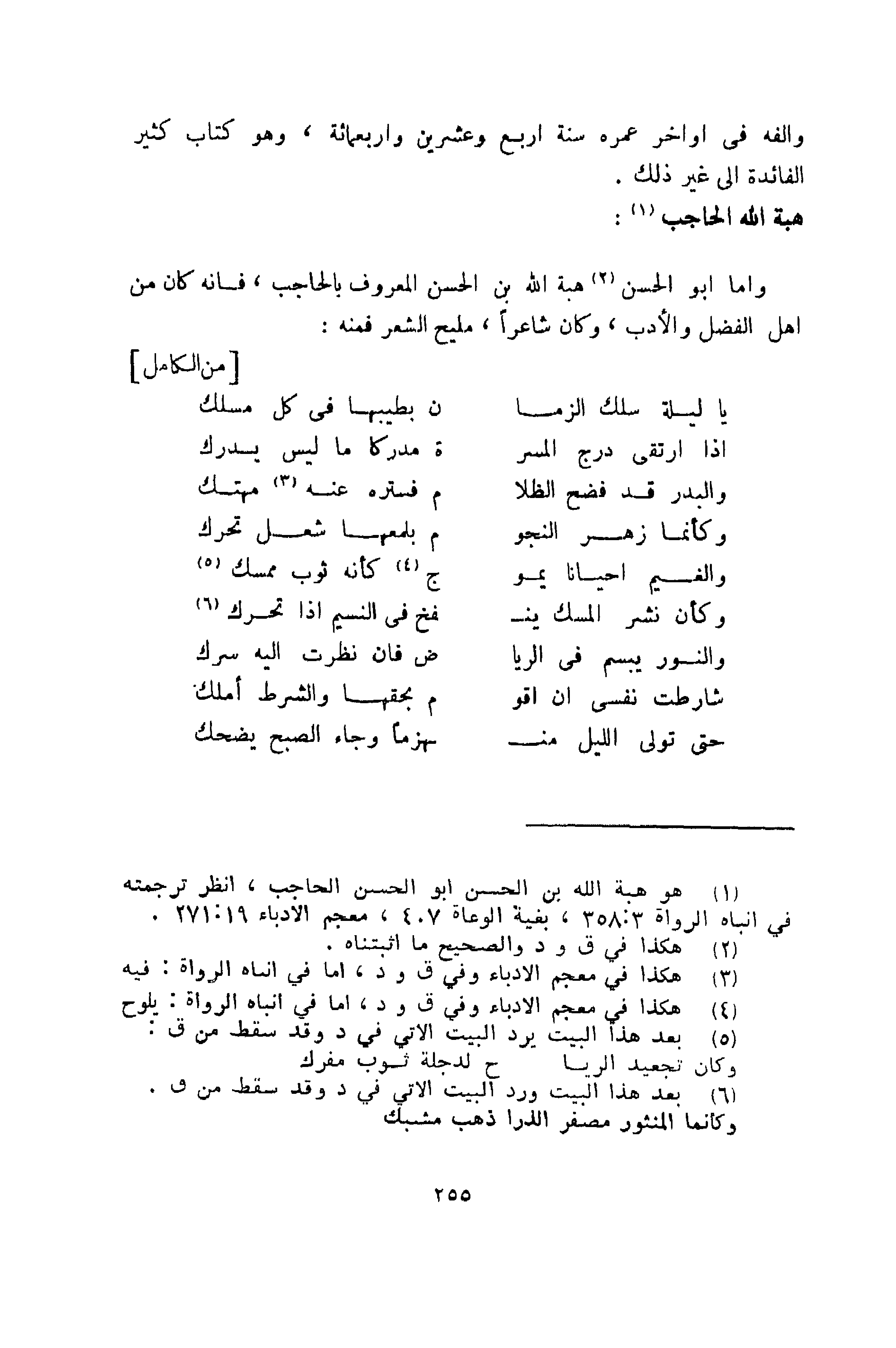وأما أبو الحسين هبة الله بن الحسن المعروف بالحاجب، فإنه كان من أهل الفضل والأدب، وكان شاعراً مليح الشعر، فمن ذلك قوله: