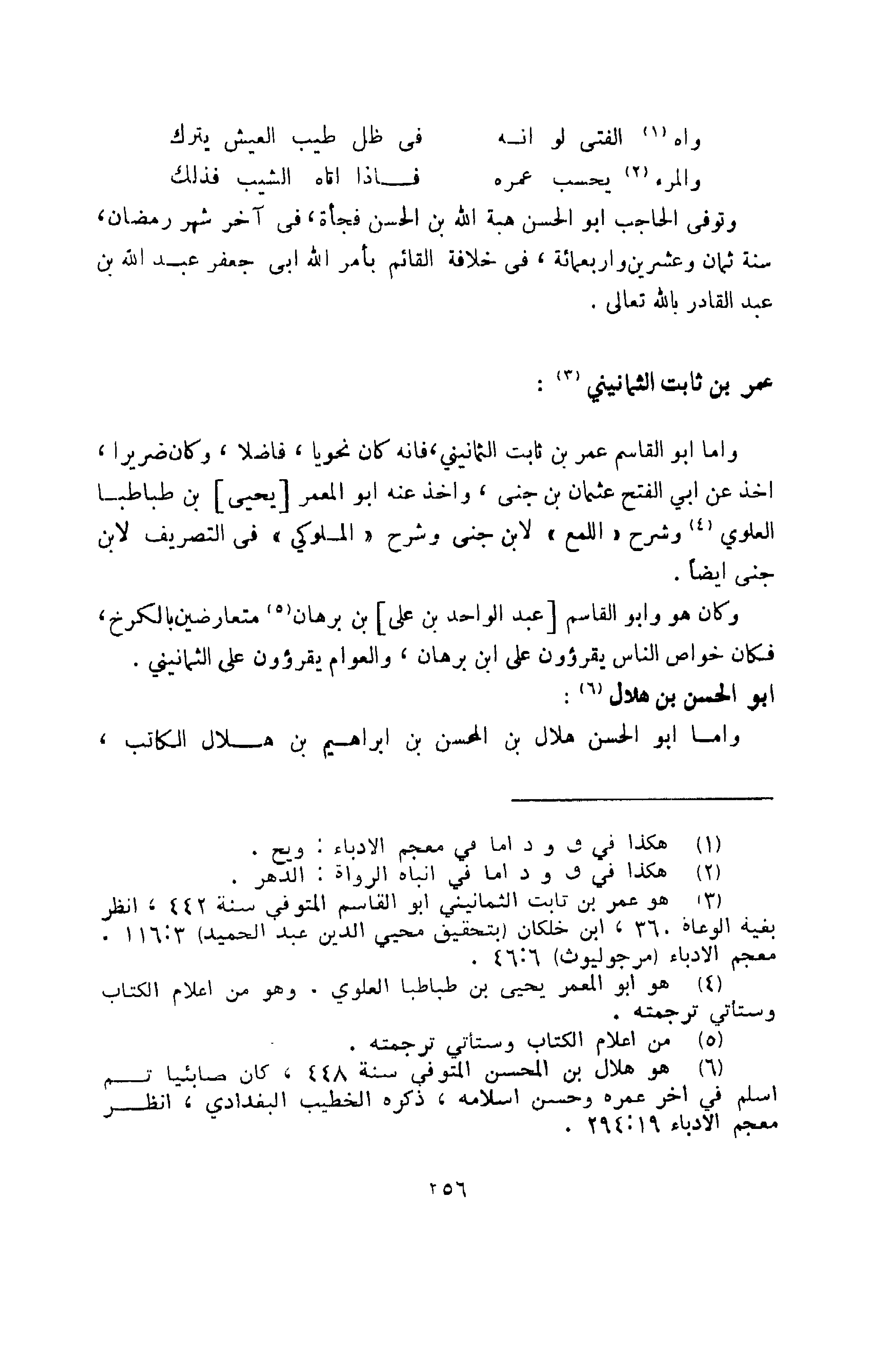 وأما أبو القاسم عمر بن ثابت الثمانيني، فإنه كان نحوياً فاضلاً، وكان ضريراً، أخذ عن أبي الفتح عثمان بن جني: وأخذ عنه أبو المعرم بن طباطبا العلوي.