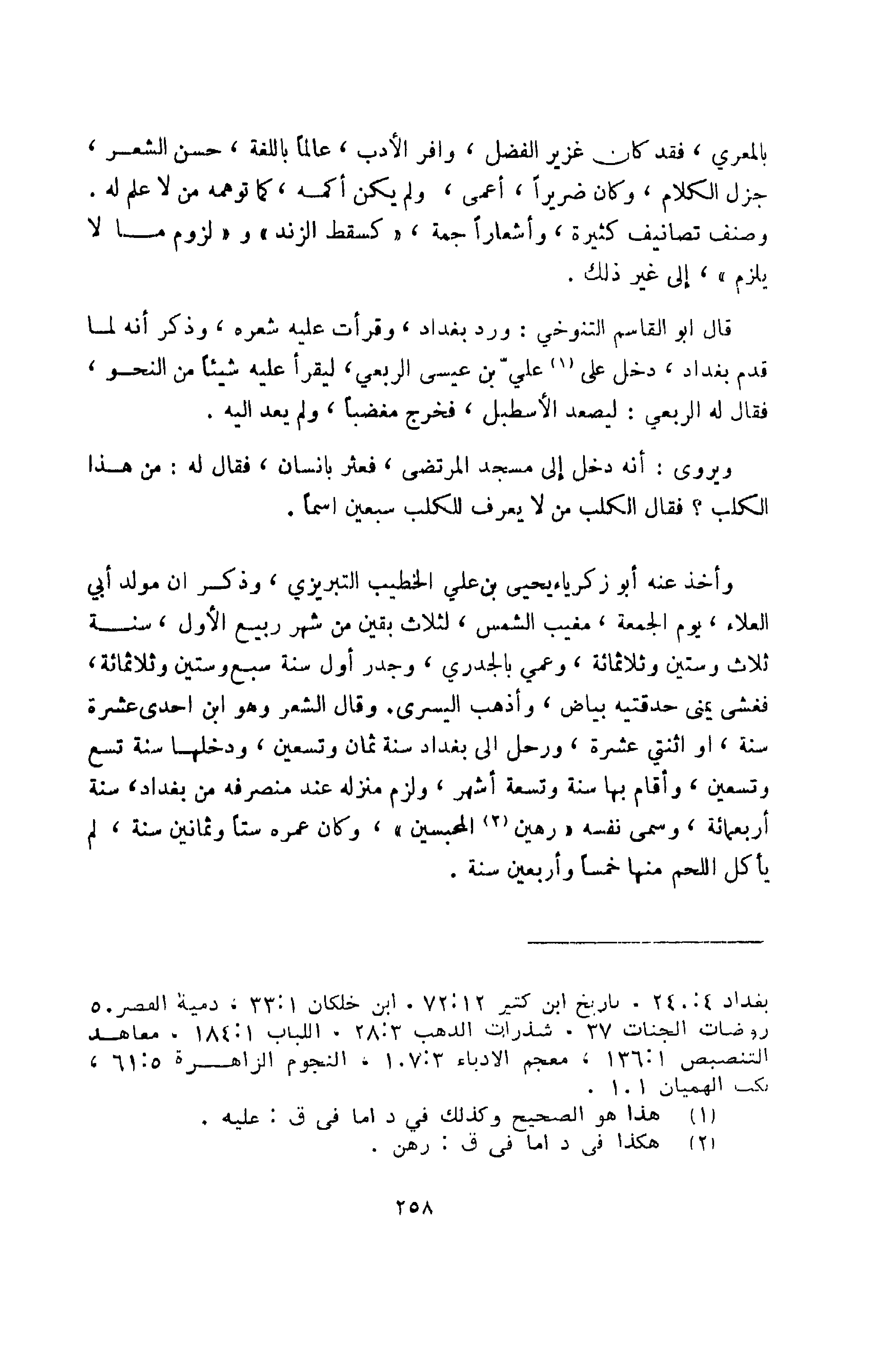 بالمعري، فإنه كان غزير الفضل، وافر الأدب، عالماً باللغة، حسن الشعر، جزل الكلام، وكان ضريراً أعمى، ولم يكن أكمه؛ كما توهمه من لا علم له.